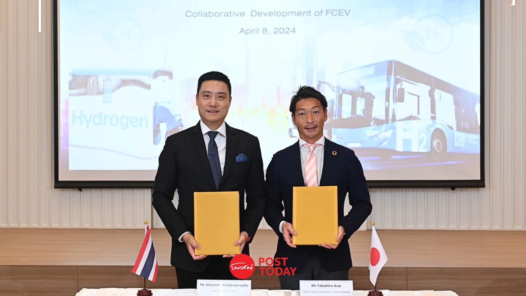 นายทาคาฮิโระ อาราอิ (Takahiro Arai) ผู้จัดการทั่วไปฝ่ายวัตถุดิบยานยนต์และเศรษฐกิจนิเวศ บริษัท โตโยต้า ทูโช คอร์ปอเรชั่น จำกัด (TOYOTA TSUSHO CORPORATION) และ นายจุน คาวามูระ ผู้อำนวยการส่วนพัฒนาโซลูชั่นพลังงาน บริษัท เดนโซ่ คอร์ปอเรชั่น จำกัด (DENSO CORPORATION) ร่วมลงนามในพิธีประกาศความร่วมมือระหว่างสามฝ่าย ซึ่งเป็นการประกาศจับมือกับบริษัท เน็กซ์ พอยท์ จำกัด (มหาชน) หรือ NEX เพื่อร่วมกันพัฒนาเทคโนโลยียานยนต์ไฟฟ้าพาณิชย์ พลังงานไฮโดรเจน รายแรกในประเทศไทย