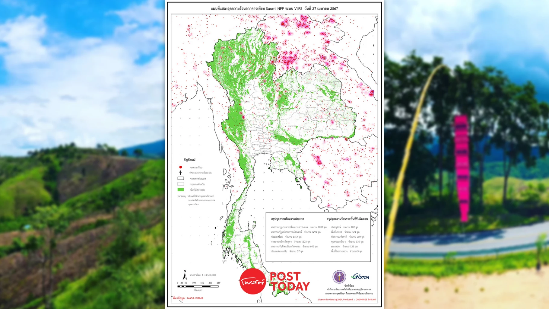 กระทรวงการอุดมศึกษา วิทยาศาสตร์ วิจัยและนวัตกรรม (อว.) โดยสำนักงานพัฒนาเทคโนโลยีอวกาศและภูมิสารสนเทศ (องค์การมหาชน) หรือ GISTDA เผยข้อมูลจากดาวเทียมซูโอมิ เอ็นพีพี (Suomi NPP) และจากดาวเทียมอีกหลายดวง เมื่อวันที่ 27 เมษายน 2567 ไทยพบจุดความร้อนทั้งประเทศ 1,357 จุด ข้อมูลจากดาวเทียมยังระบุอีกว่าจุดความร้อนที่เกิดขึ้นส่วนใหญ่พบในป่าอนุรักษ์ 482 จุด ตามด้วยพื้นที่เกษตร 324 จุด พื้นที่ป่าสงวนแห่งชาติ 289 จุด ชุมชนและพื้นที่อื่นๆ 130 จุด เขต สปก. 123 จุด และพื้นที่ริมทางหลวง 9 จุด สำหรับจังหวัดที่พบจำนวนจุดความร้อนมากที่สุด คือ #น่าน 98 จุด