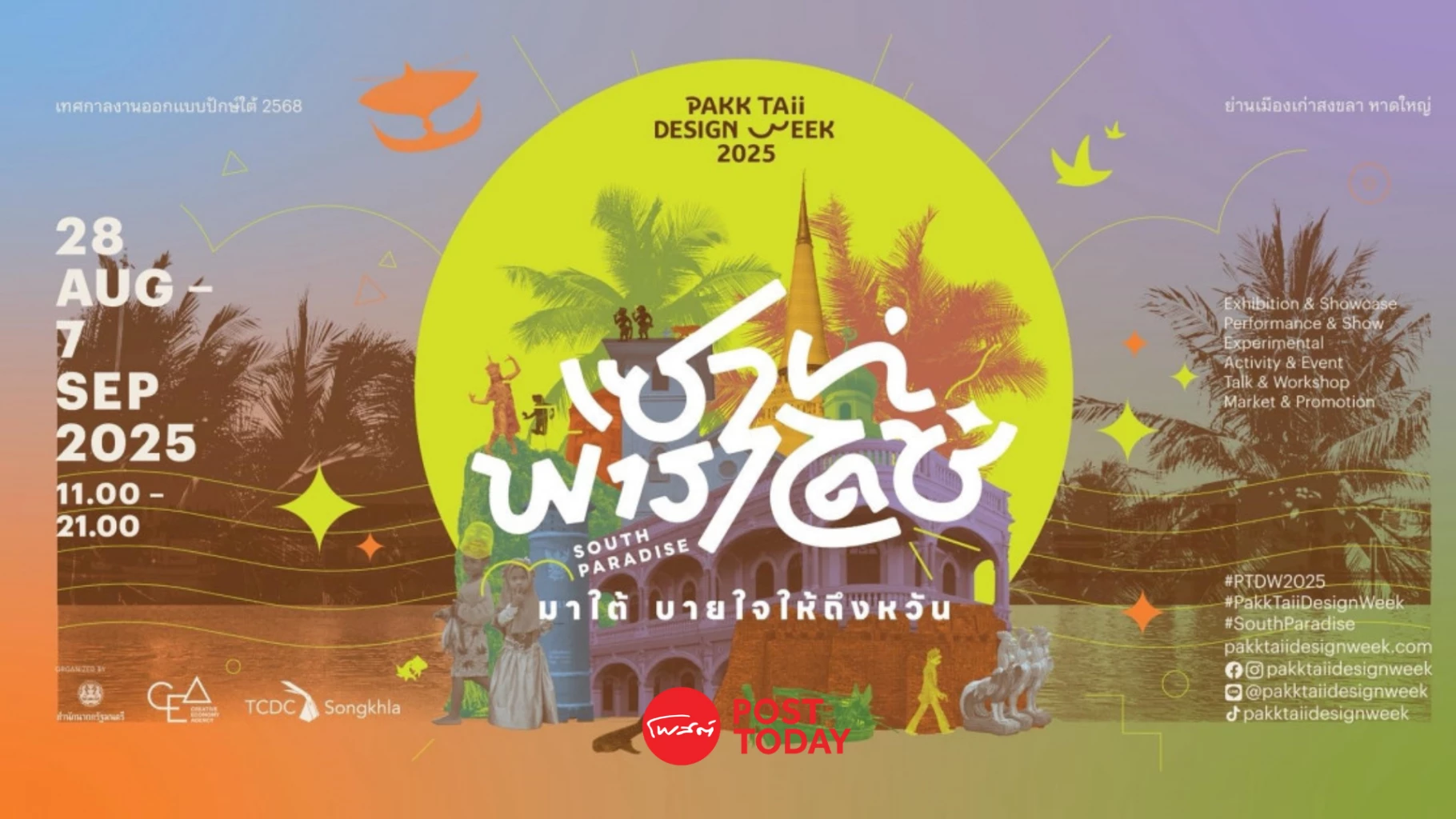 ร่วมดื่มด่ำประสบการณ์ “South Paradise มาใต้ บายใจให้ถึงหวัน” ใน “เทศกาลงานออกแบบปักษ์ใต้ 2568” (Pakk Taii Design Week 2025) หรือ PTDW2025 ระหว่างวันที่ 28 สิงหาคม - 7 กันยายน 2568 ณ ย่านเมืองเก่าสงขลาและหาดใหญ่ จังหวัดสงขลา ตั้งแต่เวลา 11.00 - 21.00 น. แล้วมาค้นหาประสบการณ์ใหม่ที่สะท้อนความสุขสำราญใจในแบบฉบับ ‘ปักษ์ใต้ที่มีดีไม่เหมือนใคร’ ไปด้วยกัน