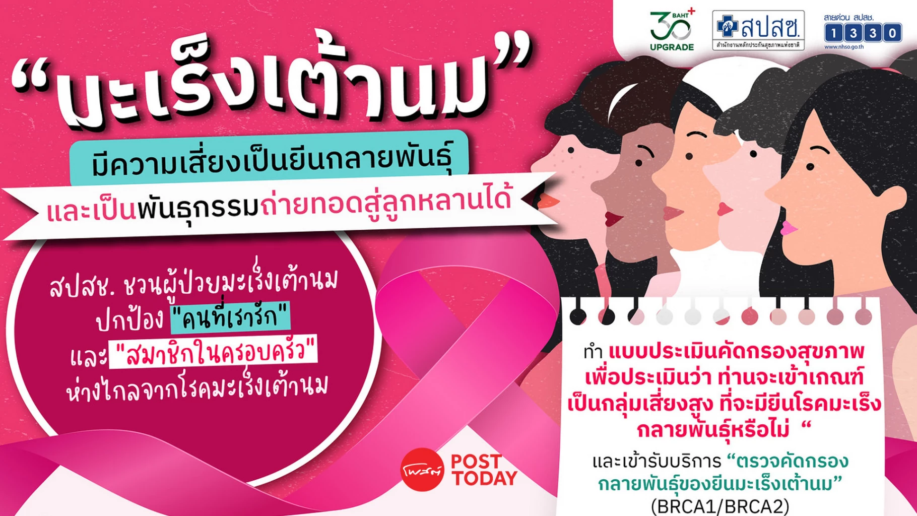 สปสช. ชวนผู้ป่วยมะเร็งเต้านมทำแบบประเมินความเสี่ยง รับสิทธิตรวจคัดกรองยีน BRCA1/BRCA2 พร้อมสิทธิประโยชน์บัตรทอง ไม่เสียค่าใช้จ่าย เริ่ม 15 ม.ค. นี้