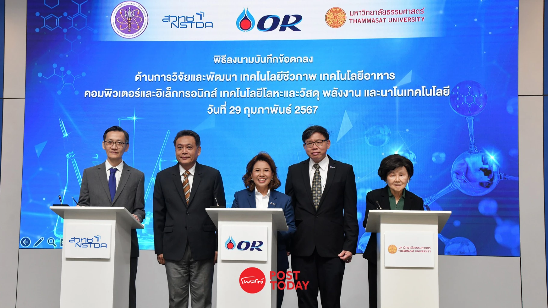 กระทรวงการอุดมศึกษา วิทยาศาสตร์ วิจัยและนวัตกรรม (อว.) โดยสำนักงานพัฒนาวิทยาศาสตร์และเทคโนโลยีแห่งชาติ (สวทช.) และมหาวิทยาลัยธรรมศาสตร์ (มธ.) ลงนามความร่วมมือกับ บริษัท ปตท. น้ำมันและการค้าปลีก จำกัด (มหาชน) (OR) เพื่อร่วมกันวิจัยและพัฒนาเทคโนโลยีพลังงานทดแทนและนวัตกรรมสู่ความยั่งยืน ภายใต้สาขาเทคโนโลยีชีวภาพ เทคโนโลยีอาหาร คอมพิวเตอร์และอิเล็กทรอนิกส์ เทคโนโลยีโลหะและวัสดุ พลังงาน และนาโนเทคโนโลยี