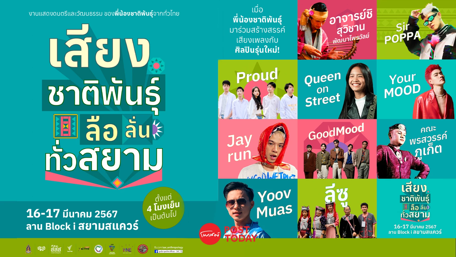 ทั้งนี้ งานแสดงดนตรีของพี่น้องชาติพันธุ์ในงาน “เสียงชาติพันธุ์ ลือลั่นทั่วสยาม” จะเป็นการแสดงที่ทำให้ทุกคนสามารถสนุกกับดนตรีเชื่อมวัฒนธรรมระหว่างศิลปินชาติพันธุ์และศิลปินรุ่นใหม่ อาทิ ชิ สุวิชาน พัฒนาไพรวัลย์ ศิลปินปกาเกอะญอ ผู้พาเสียงเตหน่า ดังไกลทั่วโลก Nimman Street Orchestra ลีซู วงดนตรีพื้นบ้าน คณะพรสวรรค์ ภูเก็ต ตำนานรองเง็งแห่งภูเก็ต Yoov Muas ศิลปิน ป๊อบชาวม้ง รุ่นใหม่ที่กำลังมาแรง Good Mood วงดนตรี ชื่อดังแห่งสยาม และ Sri Popa-Jay Run 2 แร็พเปอร์แห่งยุค ลิ้มรสอาหารและเครื่องดื่มชาติพันธุ์ เลือกซื้อสินค้าจากพี่น้องชาติพันธุ์ พร้อมเรียนรู้วัฒนธรรมชาติพันธุ์ผ่านกิจกรรมเวิร์คช็อป 16-17 มีนาคมนี้ กลางสยามสแควร์ (ลาน Block i) ตั้งแต่ 4 โมงเย็นเป็นต้นไป