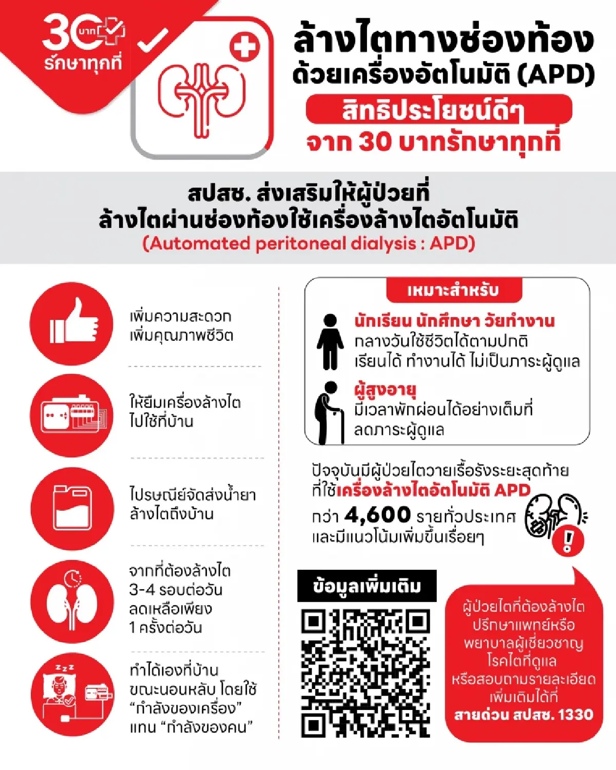 จากการเปิดเผยของ สปสช. ระบุว่าการล้างไตทางช่องท้องด้วยเครื่องอัตโนมัติ (APD) ยืนยันเป็นสิทธิประโยชน์ระบบบัตรทอง 30 บาท ไม่เสียค่าใช้จ่าย และสามารถยืมเครื่องกลับบ้านได้
