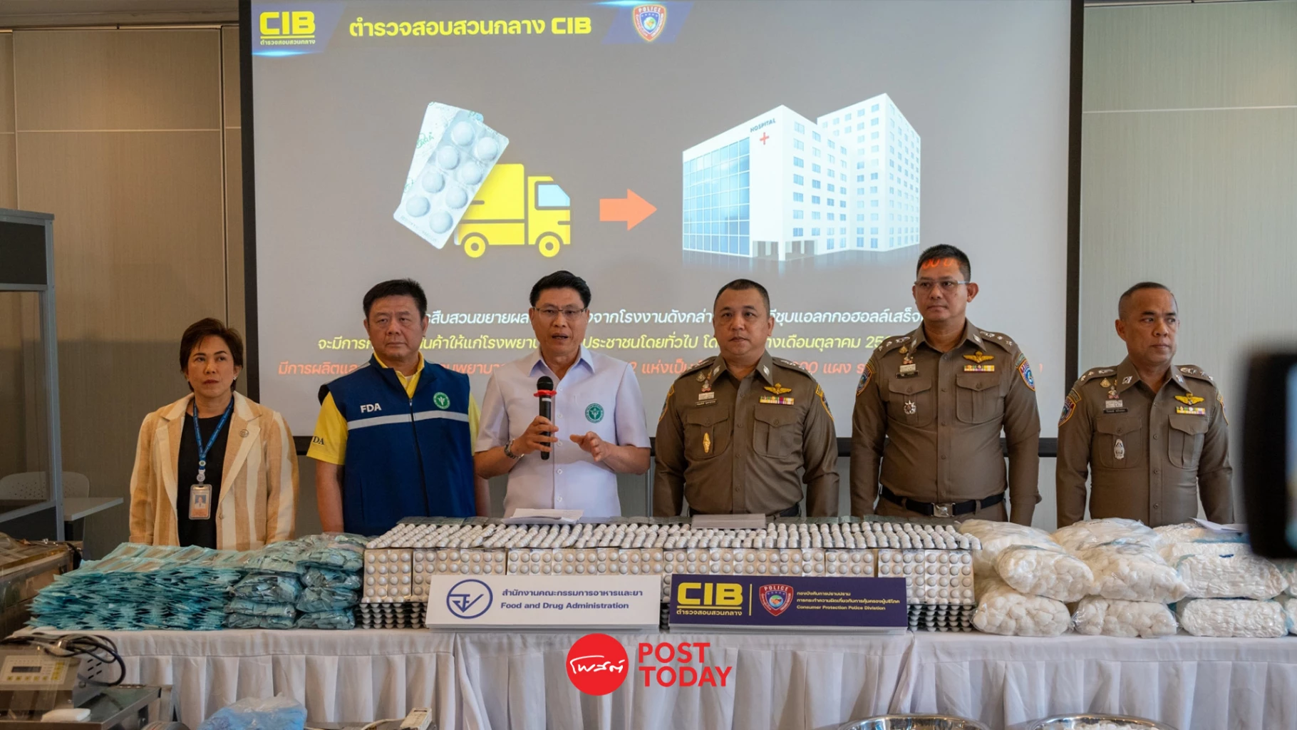 สำนักงานคณะกรรมการอาหารและยา และ กองบัญชาการตำรวจสอบสวนกลาง ร่วมกันแถลงผลการทลายโรงงานผลิตเครื่องมือแพทย์ สำลีชุบเอทิลแอลกอฮอล์ 70%v/v เถื่อน ในพื้นที่ จ.นนทบุรี ตรวจยึดของกลาง จำนวน 22 รายการ มูลค่ากว่า 2,000,000 บาท
