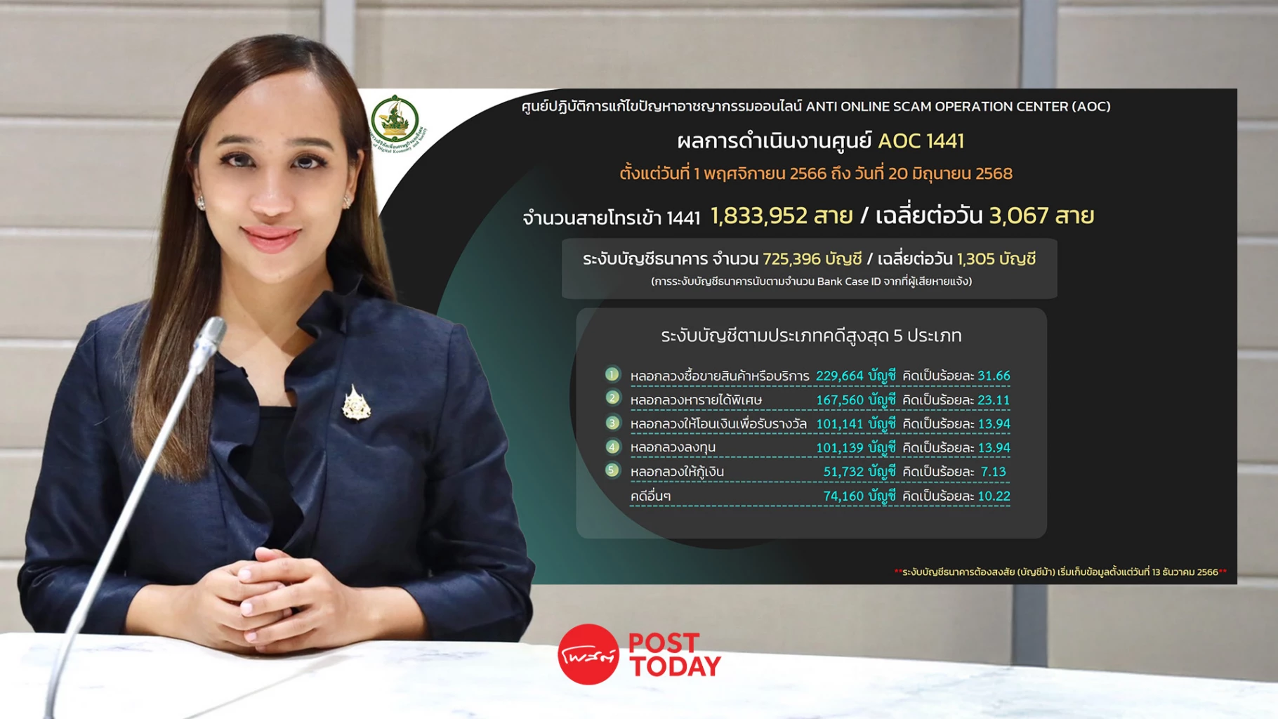 ทั้งนี้ ผลการดำเนินงานของ ศูนย์ AOC 1441 ตั้งแต่วันที่ 1 พฤศจิกายน 2566 ถึง วันที่ 20 มิถุนายน 2568 มีตัวเลขสถิติผลการดำเนินงาน ดังนี้