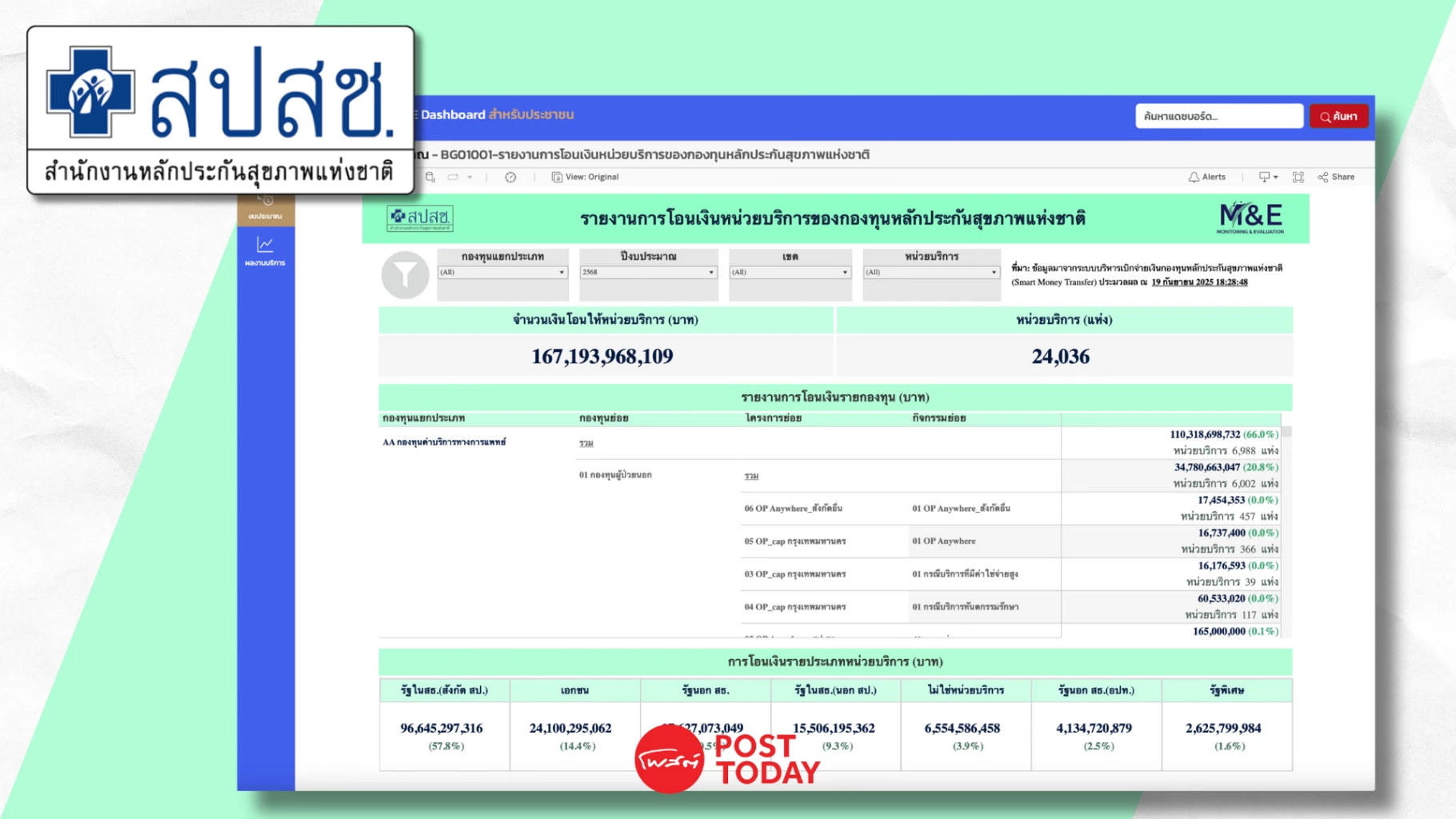 “บนเว็บไซต์รายงานจะบอกหมดเลยว่ามีรายการอะไรบ้าง ทั้งกองทุนแยกประเภท กองทุนย่อย โครงการย่อย เช่น OP Anywhere รวมถึงดูรายโรงพยาบาลได้ด้วย ในทุกสังกัดที่เข้าร่วมเป็นหน่วยบริการในระบบกับ สปสช. อย่างตอนนี้ข้อมูลล่าสุดวันที่ 19 ก.ย. 2568 ในปีงบประมาณ 2568 สปสช. มีการโอนเงินให้หน่วยบริการไปแล้ว 167,193,968,109 บาท ในจำนวนนี้โอนให้หน่วยบริการรัฐสังกัด สป.สธ. 96,645,297,316 บาท” ทพ.อรรถพร กล่าวเสริม