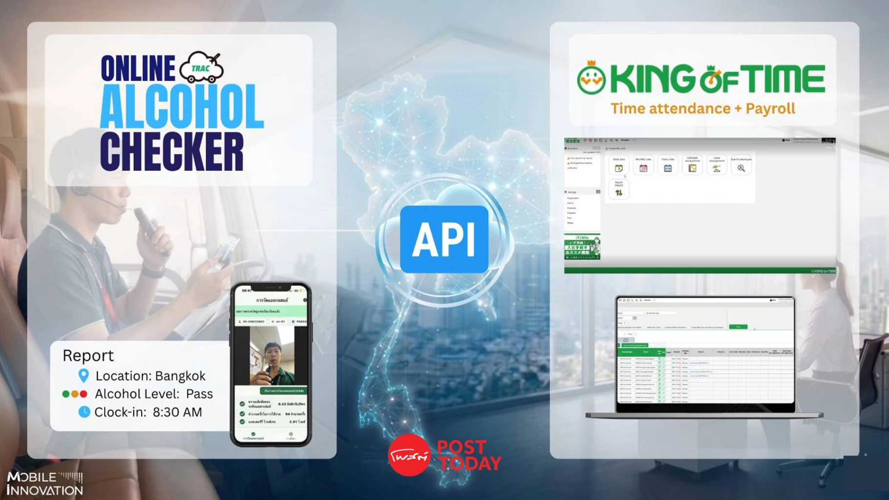 นายจุน มิโยชิ ประธานบริษัท บริษัท โมบาย อินโนเวชั่น จำกัด เผยว่า ครั้งนี้เป็นการร่วมมือในการเชื่อมต่อระบบระหว่าง “Trac Online Alcohol Checker” และแพลตฟอร์มบริหารจัดการเวลาทำงานและเงินเดือนบนคลาวด์ “KING OF TIME” ของฮิวแมน เทคโนโลยีฯ สร้างเป็นโครงข่ายข้อมูลแบบเรียลไทม์ระหว่างการตรวจวัดแอลกอฮอล์และบันทึกเวลาเข้างานของพนักงาน เพื่อเพิ่มประสิทธิภาพการจัดการความปลอดภัยสำหรับพนักงานขับรถและพนักงานหน้างาน พร้อมช่วยให้องค์กรปฏิบัติตามกฎหมายความปลอดภัยทางถนนปี 2568 ของประเทศไทยได้อย่างถูกต้อง
