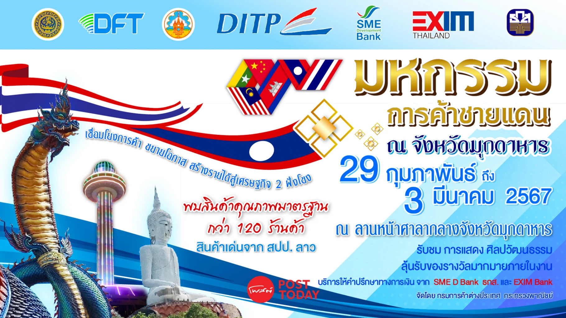 1. การจัดงานแสดงสินค้าที่ประกอบด้วยสินค้าไทยและสินค้าจากประเทศเพื่อนบ้าน จำนวน 120 คูหา ระหว่างวันที่ 29 กุมภาพันธ์ – 3 มีนาคม 2567 ณ ลานหน้าศาลากลางจังหวัดมุกดาหาร โดยจะมีพิธีเปิดงานในวันที่ 29 กุมภาพันธ์ 2567