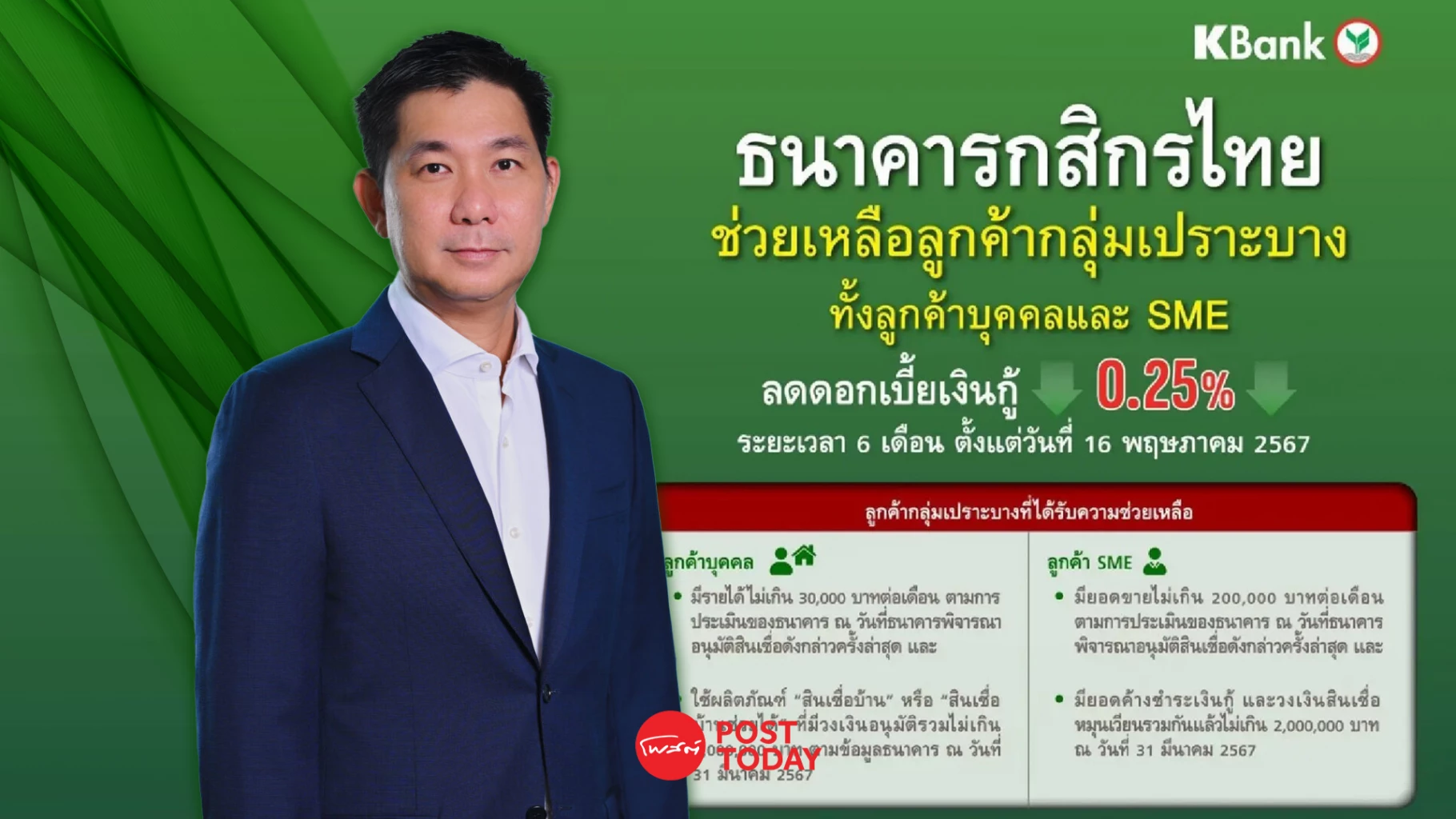 กสิกรไทยลดดอกเบี้ย 0.25% ช่วยลูกหนี้ SME