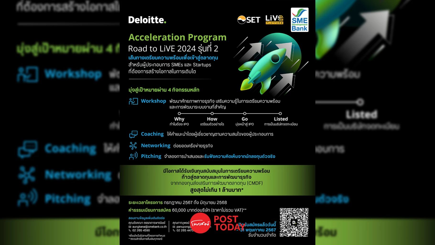 "ดีลอยท์" ร่วมกับ "SME D BANK" จัดโครงการ Acceleration Program – Road to LiVE 2024 รุ่นที่ 2 หลักสูตรติดอาวุธ SMEs- Startups ก้าวสู่ตลาดทุน เพิ่มศักยภาพธุรกิจ เสริมความรู้ในการเตรียมความพร้อมและพัฒนาระบบงานที่สำคัญ รับสมัครผู้เข้าร่วมโครงการ วันนี้ถึง 31 พฤษภาคม 2567