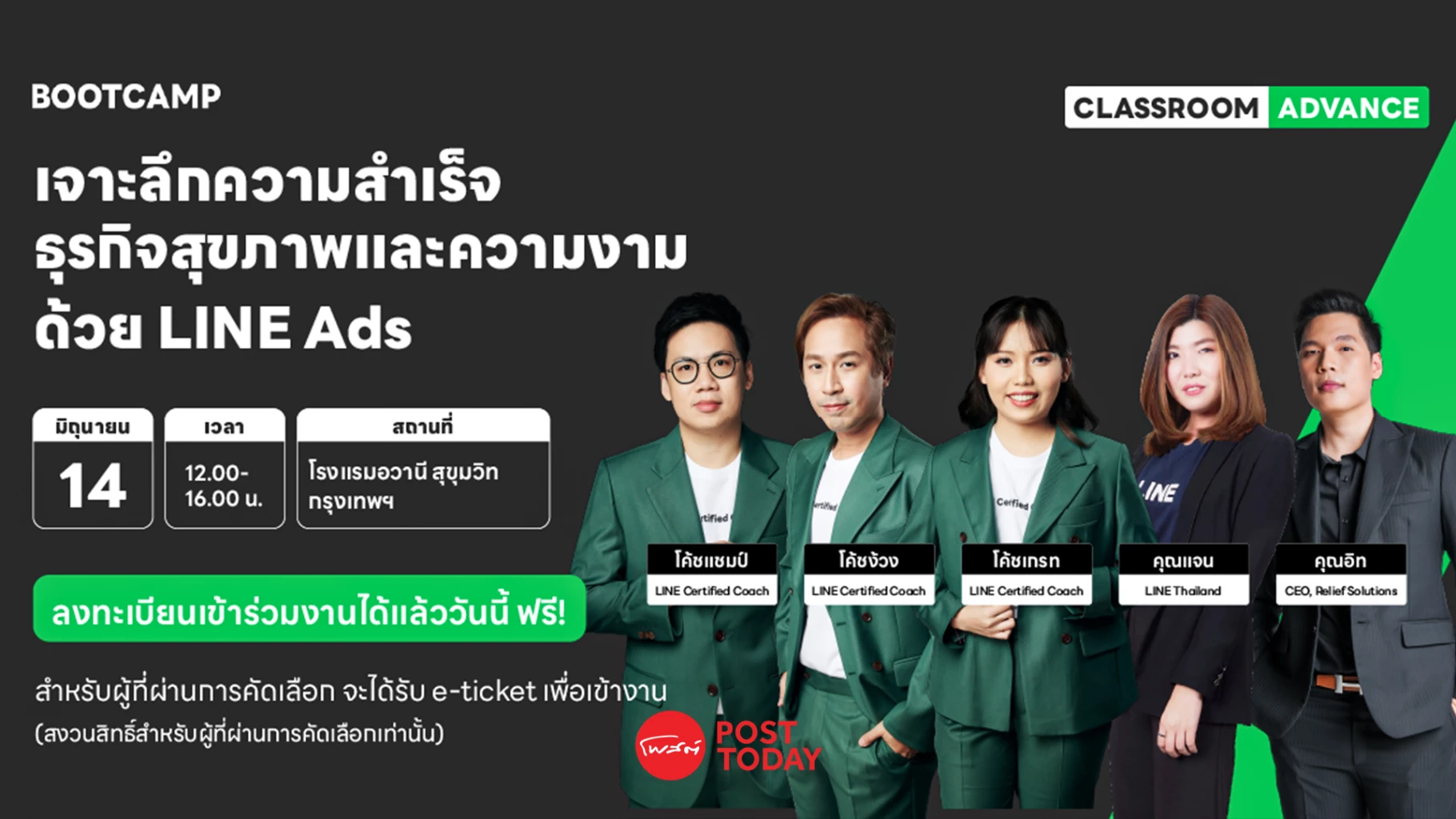 คลาสเรียน 1 วันเต็ม ที่ออกแบบเนื้อหามาเป็นพิเศษ เจาะลึกวิธีการใช้งาน LINE Ads - การลงโฆษณาบน LINE สำหรับธุรกิจสุขภาพและความงามโดยเฉพาะ โดยวิทยากรผู้เชี่ยวชาญทั้งจาก LINE ประเทศไทย และ LINE Certified Coach หลากหลายท่าน ที่จะมาร่วมแบ่งปันความรู้ ความเข้าใจ เปิดเส้นทางเงินล้านและความสำเร็จของธุรกิจสุขภาพและความงามด้วยโฆษณาผ่าน LINE Ads กันแบบไม่มีกั๊ก! ให้ผู้ประกอบการทุกท่าน สามารถนำไปประยุกต์ใช้ สร้างความสำเร็จให้ธุรกิจตนเองผ่าน LINE Ads กันถ้วนหน้า! โดยเนื้อหาจะครอบคลุมทั้งการทำความรู้จัก LINE Ads เบื้องต้นให้เข้าใจ เทคนิคปั้นเงินล้านผ่านการยิงโฆษณาบน LINE พร้อมช่วงแบ่งปันประสบการณ์จริงจาก คุณอิท - อิทธิพร จันทร์มา CEO บริษัท รีไลฟ์โซลูชั่น แบรนด์สุขภาพและความงามชื่อดัง ที่จะมาร่วมเผยเคล็ดลับการใช้ LINE Ads สู่ความสำเร็จกันแบบเอ็กซ์คลูซีฟ และที่ขาดไม่ได้ กับกิจกรรมภาคปฎิบัติปิดท้าย ให้ผู้ประกอบการที่เข้าร่วม ได้เรียนรู้วิธีการยิงโฆษณา LINE Ads อย่างจริงจัง ด้วยเวิร์คช้อปสุดพิเศษกับ 5 เทคนิคสุดปังในการยิงโฆษณาให้เห็นผลทันตา เจอลูกค้าตัวจริง