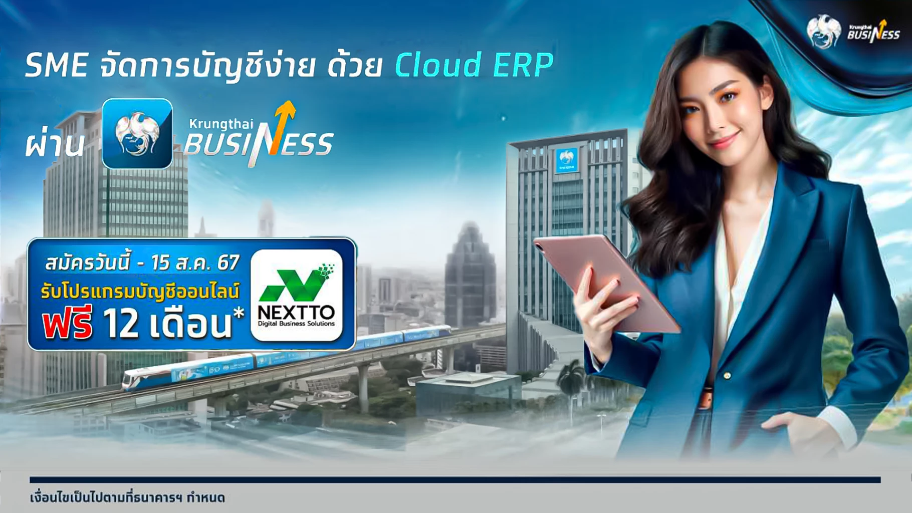 ธนาคารจัดโปรโมชัน มอบสิทธิพิเศษสำหรับลูกค้าธุรกิจที่ใช้บริการ Krungthai BUSINESS ครั้งแรก เพียงสมัครใช้แพ็กเกจ SME Plus (599 บาทต่อปี) หรือแพ็กเกจ SME Super Smart (1,199 บาทต่อปี) แพ็กเกจใดก็ได้ พร้อมบริการ Cloud ERP, บริการ Krungthai EIPP และบริการ Krungthai eTax Invoice/e-Receipt รับสิทธิในการใช้โปรแกรมบัญชีออนไลน์ฟรี 12 เดือน จากพันธมิตร ตั้งแต่วันนี้ ถึง 15 สิงหาคม 2567 จำกัดเพียง 700 สิทธิเท่านั้น
