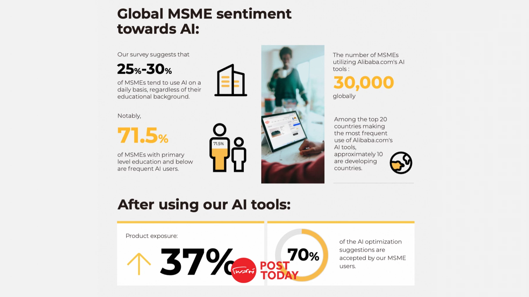 แบบสำรวจยังพบอีกว่าธุรกิจ MSMEs กว่า 30,000 รายทั่วโลกใช้เครื่องมือ AI ของแพลตฟอร์มบน Alibaba.com เพียงอย่างเดียว เหล่าธุรกิจที่ได้รับการสำรวจระบุว่าจากการใช้ประโยชน์จากเครื่องมือเหล่านี้ทำให้มีการเข้าถึงผลิตภัณฑ์เพิ่มขึ้นถึง 37% ซึ่งสร้างโอกาสมากขึ้นสำหรับข้อตกลงทางธุรกิจใหม่และการเติบโตของธุรกิจ นอกจากนี้ธุรกิจ MSMEs ที่ได้รับการสำรวจซึ่งใช้เครื่องมือ AI ของ Alibaba.com อยู่แล้ว กำลังต่อยอดธุรกิจของตนผ่านความเชี่ยวชาญของ AI เนื่องจากพวกเขาได้ยอมรับข้อเสนอแนะการเพิ่มประสิทธิภาพจากเครื่องมือเหล่านี้ร่วมกันถึง 70%