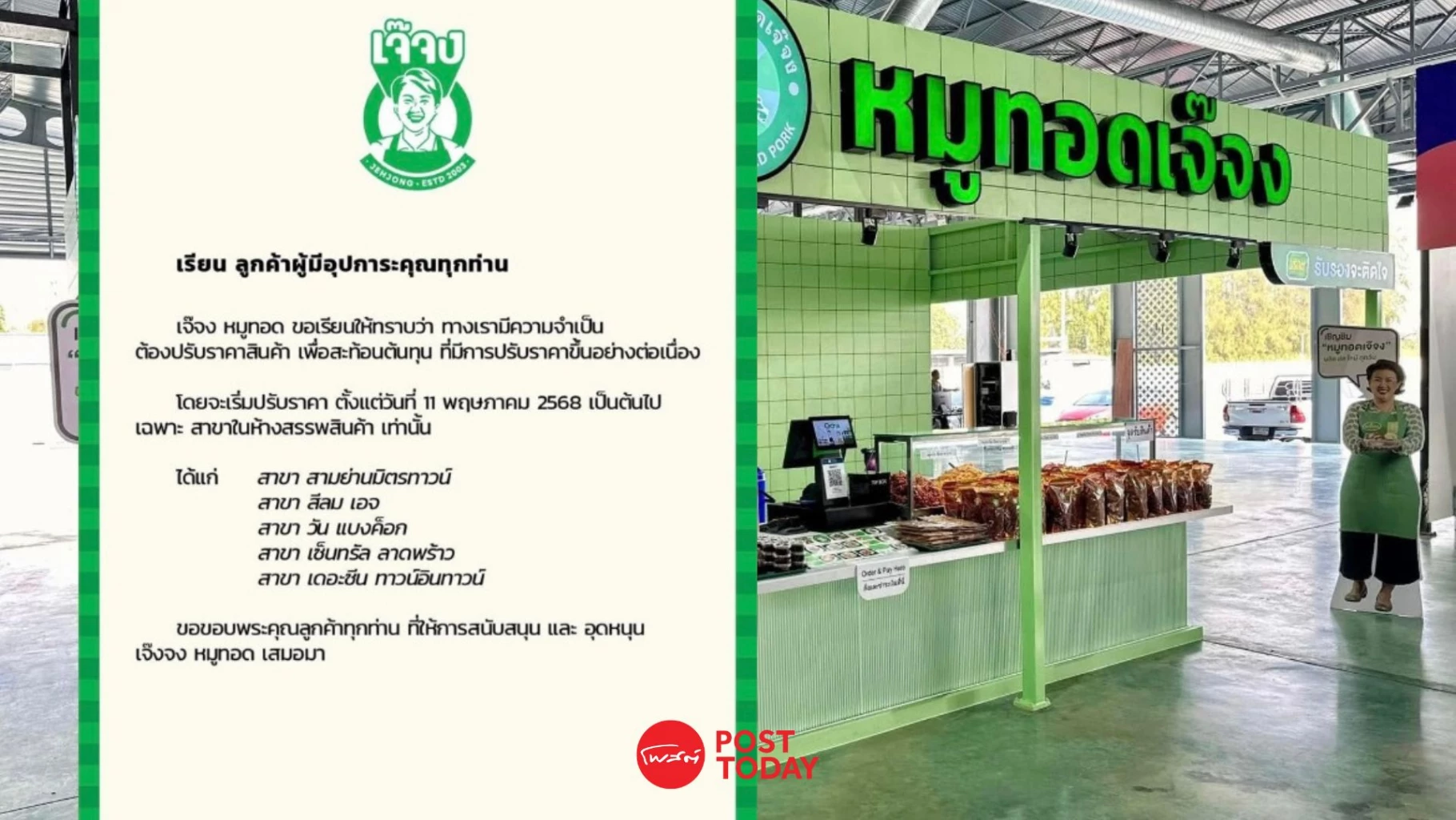 หมูแพงเป็นเหตุ ร้าน ”หมูทอด เจ๊จง” ประกาศปรับราคาสินค้า 5 สาขา เริ่ม 11 พ.ค. 2568 เหตุต้นทุนสูงต่อเนื่อง พร้อมระบุหากราคาวัตถุดิบลดลง จะปรับราคาลง