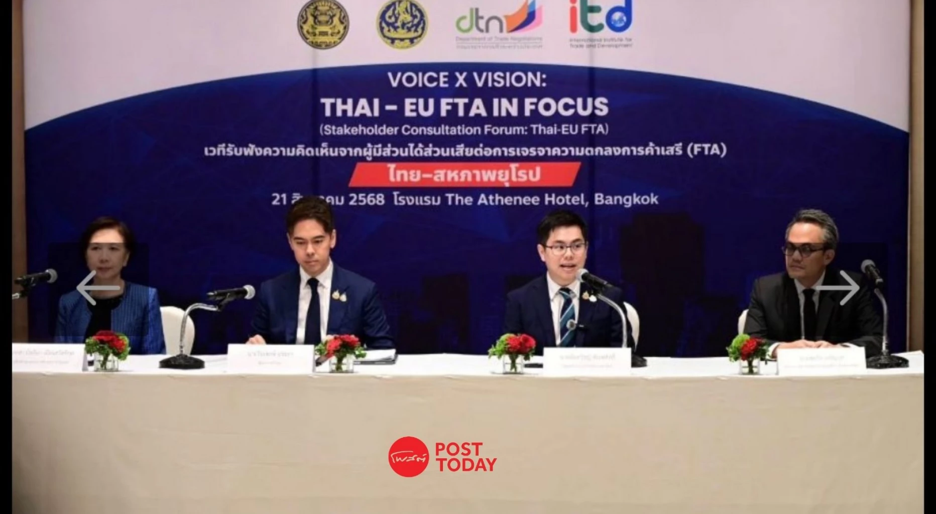 นายฉันทวิชญ์ ตัณฑสิทธิ์ รัฐมนตรีช่วยว่าการกระทรวงพาณิชย์ แถลงผลการจัดเวทีรับฟังความคิดเห็นจากผู้มีส่วนได้ส่วนเสียต่อการเจรจาความตกลงการค้าเสรีไทย–สหภาพยุโรป ภายใต้งาน “Voice x Vision: Thai-EU FTA in Focus” (Stakeholder Consultation Workshop: Thai-EU FTA) ว่า การเจรจา FTA ไทย–EU มีความคืบหน้าเป็นอย่างดี โดยมีการเจรจาแล้ว 6 รอบ และสามารถสรุปความตกลงได้แล้ว 7 บท จากทั้งหมด 24 บท ประมาณ 1 ใน 3 หากบรรลุผลสำเร็จ จะเป็นโอกาสสำคัญต่อการค้าและการลงทุนของไทย สร้างแต้มต่อให้ผู้ประกอบการและเกษตรกรไทยสามารถเข้าถึงตลาดสหภาพยุโรปที่มีขนาดใหญ่และกำลังซื้อสูง พร้อมดึงดูดการลงทุนจากธุรกิจยุโรปในอุตสาหกรรมอนาคต เช่น เทคโนโลยีชีวภาพ พลังงานหมุนเวียน และยานยนต์ไฟฟ้า