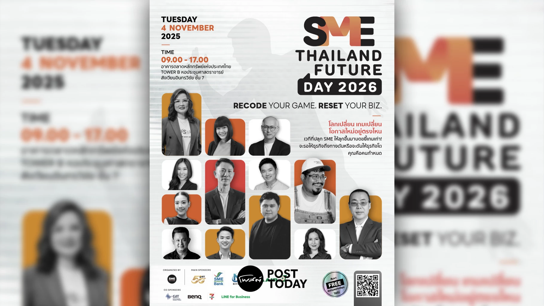 งาน SME Thailand Future Day 2026 “เวทีที่จะปลุกคุณให้ลุกขึ้น…บดขยี้เกมเก่า และสร้างเกมใหม่ของตัวเอง” นี่ไม่ใช่แค่งานสัมมนา…นี่คือ สนามรีเซ็ตอนาคตธุรกิจ ที่จะเปิดรหัสใหม่ให้คุณมองเกมธุรกิจด้วยเลนส์อนาคตฟังแนวคิดและกลยุทธ์จาก Speaker ผู้เชี่ยวชาญ