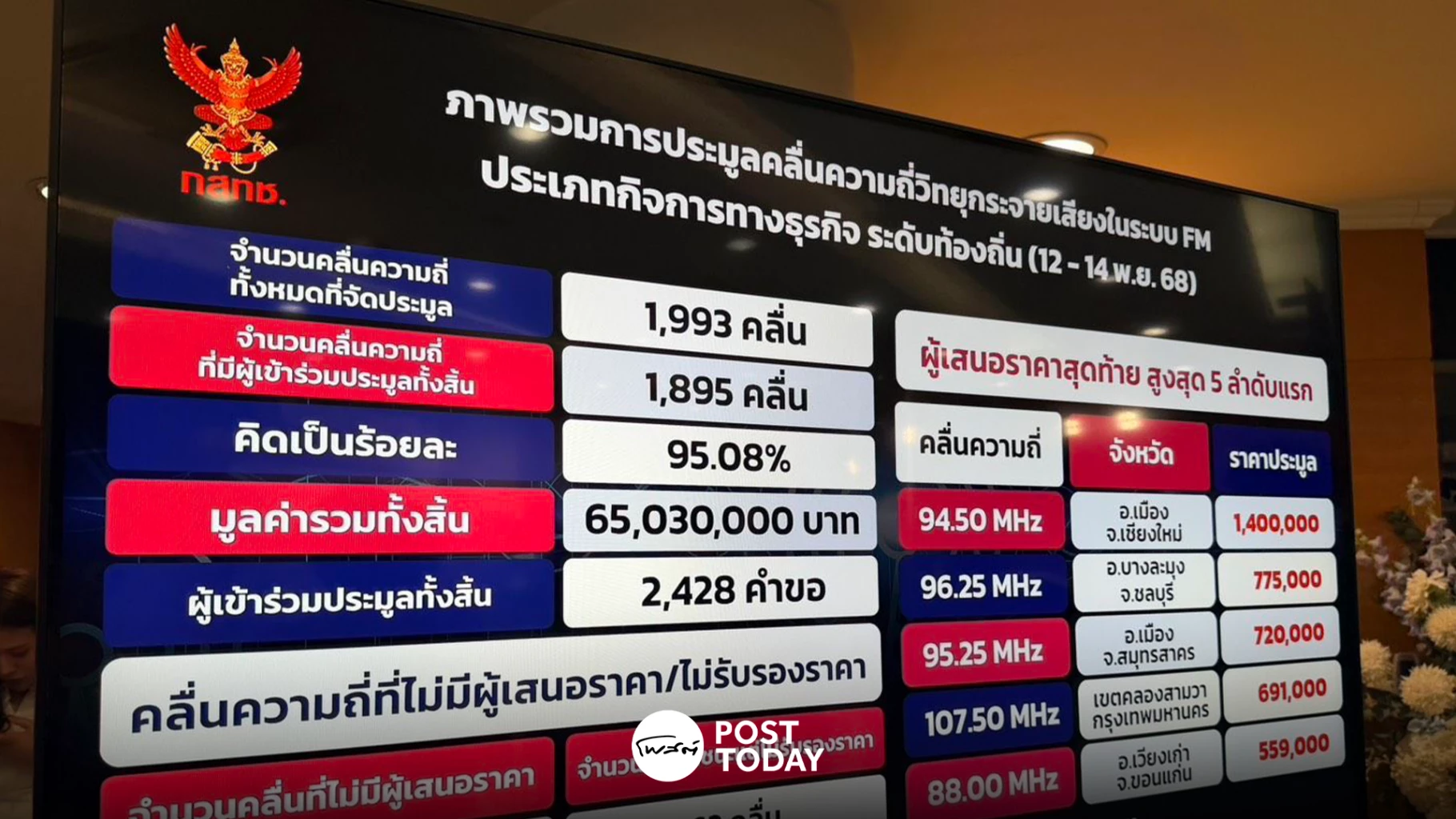 วันสุดท้ายของการประมูลวิทยุชุมชน เมื่อวันที่ 14 พ.ย. 2568 ที่ผ่านมา โดยสำนักงานคณะกรรมการกิจการกระจายเสียง กิจการโทรทัศน์ และกิจการโทรคมนาคมแห่งชาติ (กสทช.) สรุปมีผู้เข้าร่วม 2,237 นิติบุคคล โดยมีผู้เสนอราคาสุดท้ายสูงสุดรวมทั้งสิ้น 1,895 คลื่นความถี่ จากทั้งหมด 1,993 คลื่นความถี่ คงเหลือ 98 คลื่นความถี่ คิดเป็นร้อยละ 4.92 มูลค่าประมูลรวมทั้งสิ้น 65,030,000 บาท ซึ่งคลื่นความถี่ที่มีการเสนอราคาสูงสุด 5 คลื่นความถี่ ประกอบด้วย