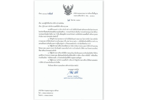วันนี้(29 ส.ค.) สำนักงานคณะกรรมการการศึกษาขั้นพื้นฐาน กระทรวงศึกษาธิการ ลงนามโดยนายกมล รอดคล้าย เลขาธิการกรรมการศึกษาขั้นพื้นฐาน ได้มีคำสั่งถึงผู้อำนวยการเขตพื้นที่การศึกษาทุกเขตเกี่ยวกับแนวปฏิบัติการให้การบ้านนักเรียน โดยมีคำสั่งห้ามให้การบ้านมากเกินไปหรือยากเกินไป ให้เน้นงานกลุ่มมากขึ้น