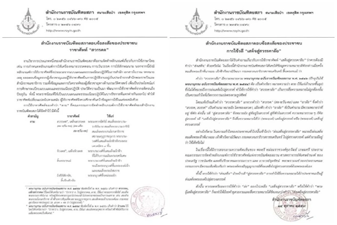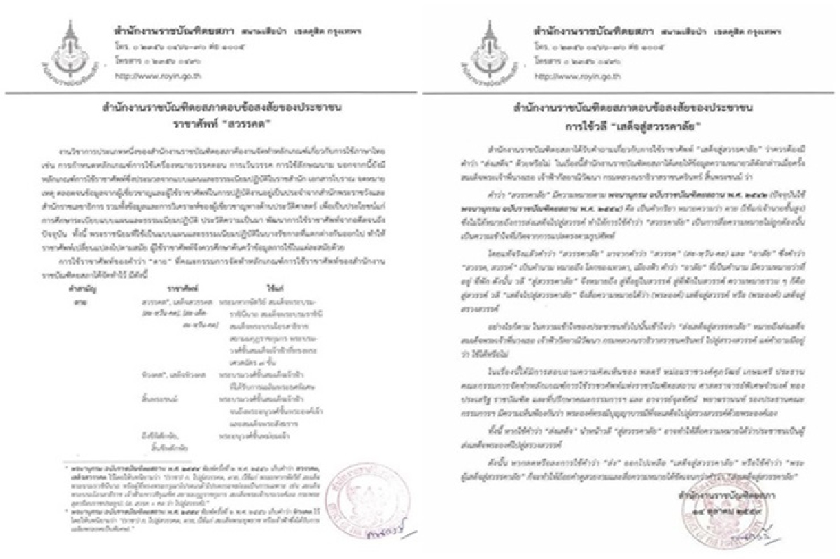 เฟซบุ๊กเพจ "ราชบัณฑิตยสภา" ได้โพสต์รูปภาพและข้อความ ตอบข้อสงสัยของประชาชน 2 เรื่อง คือ ราชาศัพท์ "สวรรคต" และการใช้วลี "เสด็จสู่สวรรคาลัย" โดยกรณีราชาศัพท์ "สวรรคต" สำนักงานราชบัณฑิตยสภาตอบข้อสงสัยว่า การใช้คำราชาศัพท์ของคำว่า "ตาย" คณะกรรมการจัดทำหลักเกณฑ์การใช้คำราชาศัพท์ของสำนักงานราชบัณฑิตยสภาได้จัดทำไว้ ดังนี้