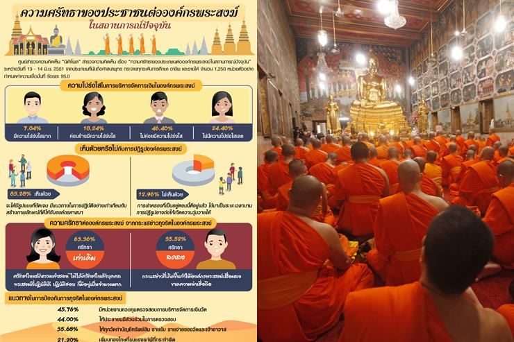 เมื่อถามถึงความศรัทธาของประชาชนต่อองค์กรพระสงฆ์ จากกระแสข่าวการทุจริตในองค์กรพระสงฆ์ พบว่า ประชาชนส่วนใหญ่ ร้อยละ 63.36 ระบุว่า มีความศรัทธาต่อองค์กรพระสงฆ์เท่าเดิม เพราะ ศรัทธาในหลักธรรมคำสอนไม่ได้ศรัทธาที่ตัวบุคคล ขณะที่บางส่วน ระบุว่า พระสงฆ์ที่ปฏิบัติดี ปฏิบัติชอบ ก็มีอยู่เยอะ รองลงมา ร้อยละ 35.52 ระบุว่า มีความศรัทธาต่อองค์กรพระสงฆ์ลดลง เพราะ กระแสข่าว ที่เกิดขึ้นทำให้องค์กรพระสงฆ์เสื่อมลง ขาดความน่าเชื่อถือ ร้อยละ 0.48 ระบุอื่น ๆ ได้แก่ ไม่มีความศรัทธาต่อองค์กรพระสงฆ์เลย และร้อยละ 0.64 ไม่ระบุ/ไม่แน่ใจ
