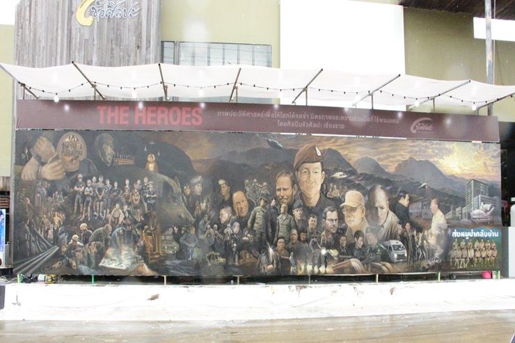 วันที่ 20 ก.ค.61 ที่ขัวศิลปะ บ้านขัวแคร่ ต.บ้านดู่ อ.เมือง จ.เชียงราย ภาพ THE HERO ที่วาดโดยศิลปินที่ร่วมกันจากทั้งในภาคเหนือ เช่น เชียงราย เชียงใหม่ พะเยา ลำปาง และจากกรุงเทพฯ ที่มาร่วมกันวาดภาพเพื่อรำลึกถึงเหตุการณ์ที่ น้องนักเตะทีมหมูป่าอะคาเดมี่ และโค้ช รวม 13 คน โดยภาพวาดเป็นเหตุการณ์ตั้งแต่ที่ทราบว่าทีมหมูป่าติดอยู่ภายในถ้ำ จนถึงการช่วยเหลือต่างๆ ทั้งจากเจ้าหน้าที่ที่เข้าไปร่วมค้นหา จิตอาสาที่มาช่วยทำอาหาร และบริการด้านต่างๆ  เครื่องสูบน้ำ ฯลฯ จนถึงเหตุการณ์การแถลงข่าวส่งหมูป่ากลับบ้าน