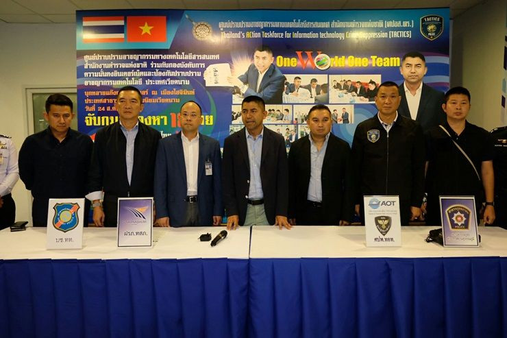 เมื่อเวลา 23.00 น.วันที่ 24 ส.ค.2561 พล.ต.ต.สุรเชษฐ์ หักพาล รอง ผบช.ทท. หัวหน้าชุดปฏิบัติการประจำศูนย์ปราบปรามอาชญากรรมทางเทคโนโลยีสารสนเทศ สำนักงานตำรวจแห่งชาติ (ศปอส.ตร.) พร้อมด้วย พ.ต.อ.อาชยน ไกรทอง รอง ผบก.ทท.1 บช.ทท. พ.ต.อ.พนัญชัย ชื่นใจธรรม รอง ผบก.ทท.2 บช.ทท. พ.ต.อ.นิธิธร จินตกานนท์ รอง ผบก.สปพ.บช.น.และนายกิตติพงศ์ กิตติขจร รองผอ.ท่าอากาศยานสุวรรณภูมิ ร่วมกันแถลงผลการกวาดล้างแก๊งคอลเซ็นเตอร์ที่ประเทศเวียดนามได้ผู้ต้องหา 18 ราย ณ ห้องประชุมชั่วคราว สภ.ท่าอากาศยานสุวรรณภูมิ จ.สมุทรปราการ