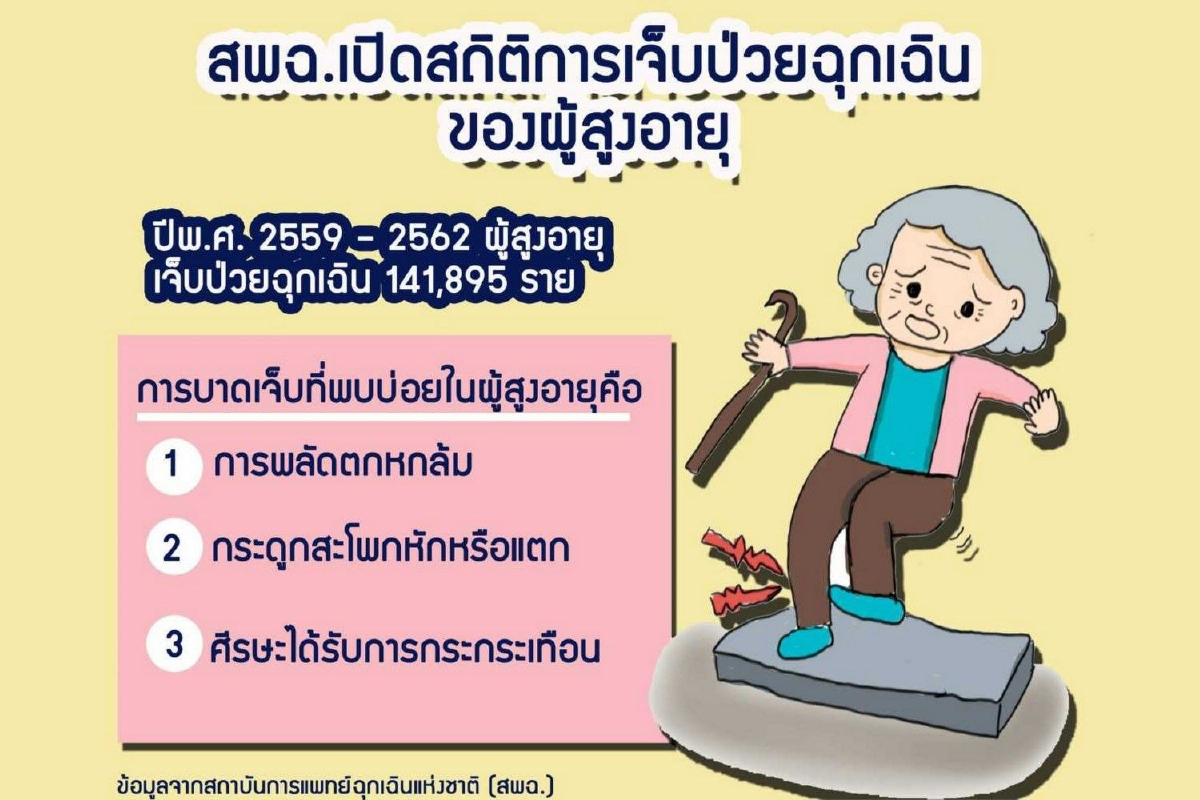 สพฉ.เปิดสถิติการพลัดตกหกล้มในผู้สูงอายุ พบในรอบ 3 ปี มีผู้สูงอายุได้รับบาดเจ็บต้อใช้บริการระบบแพทย์ฉุกเฉิน 141,895 ราย แนะปรับสิ่งแวดล้อมในบ้านให้เหมาะสมเพื่อลดความเสี่ยง