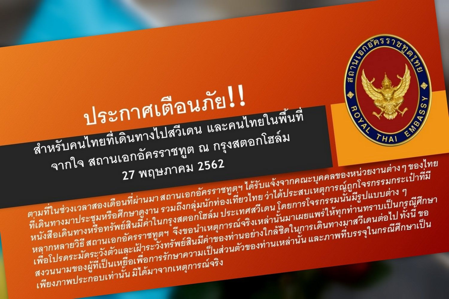 ประกาศสถานเอกอัครราชทูต ณ กรุงสตอกโฮล์ม เรื่อง แจ้งเตือนคนไทยที่เดินทางไปสวีเดน