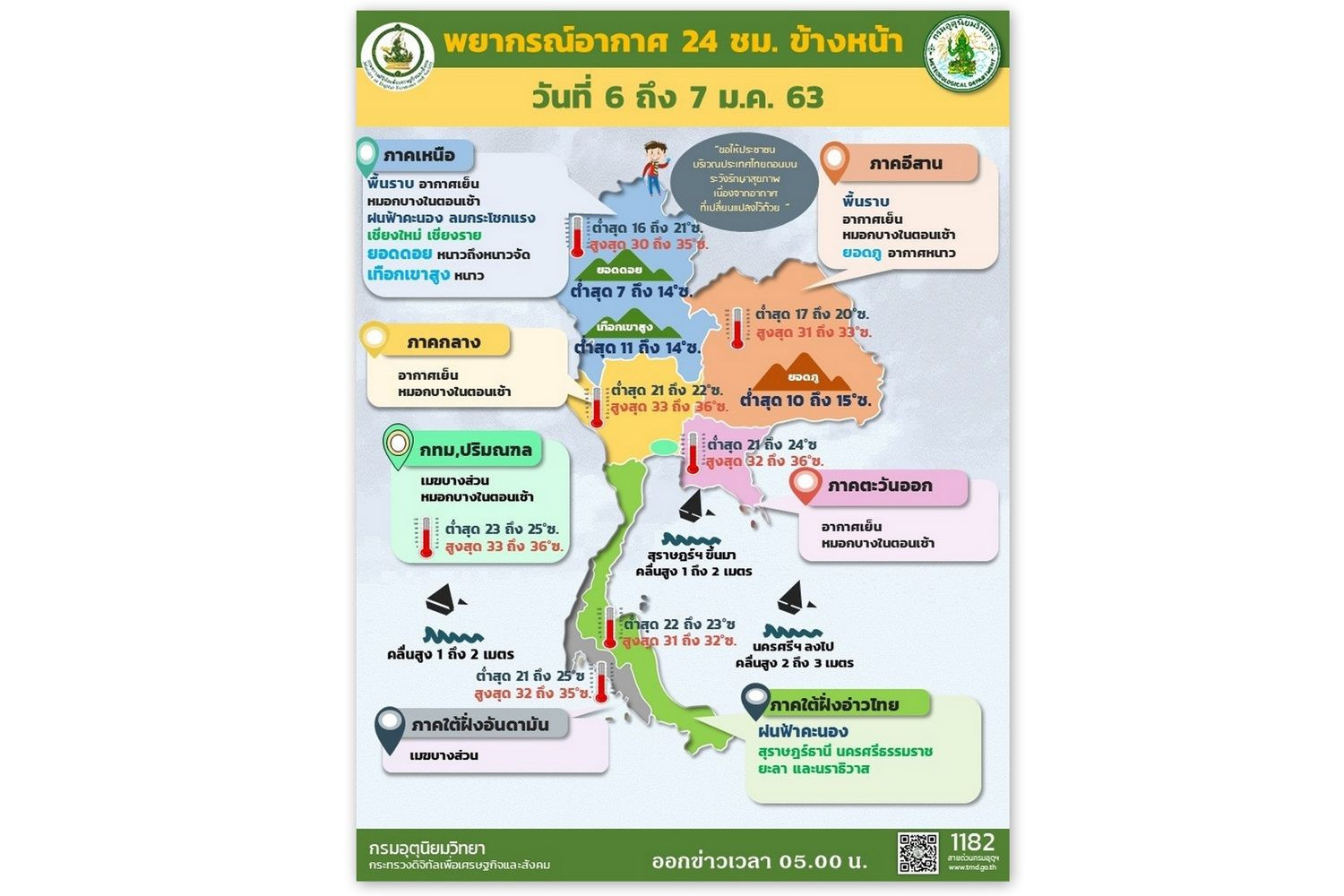 กรมอุตุนิยมวิทยา รายงานลักษณะอากาศทั่วไป ประจำวันที่ 6 มกราคม 2563 ลักษณะอากาศทั่วไป พยากรณ์อากาศ 24 ชั่วโมงข้างหน้า ประเทศไทยตอนบนมีหมอกบางในตอนเช้า ส่วนบริเวณพื้นราบของภาคเหนือและภาคตะวันออกเฉียงเหนือมีอากาศเย็น อุณหภูมิต่ำสุด 17-21 องศาเซลเซียส บริเวณยอดดอยและยอดภูมีอากาศหนาวถึงหนาวจัด อุณหภูมิต่ำสุด 7-15 องศาเซลเซียส ขอให้ประชาชนบริเวณประเทศไทยตอนบนระมัดระวังในการสัญจรผ่านบริเวณที่มีหมอกไว้ด้วย