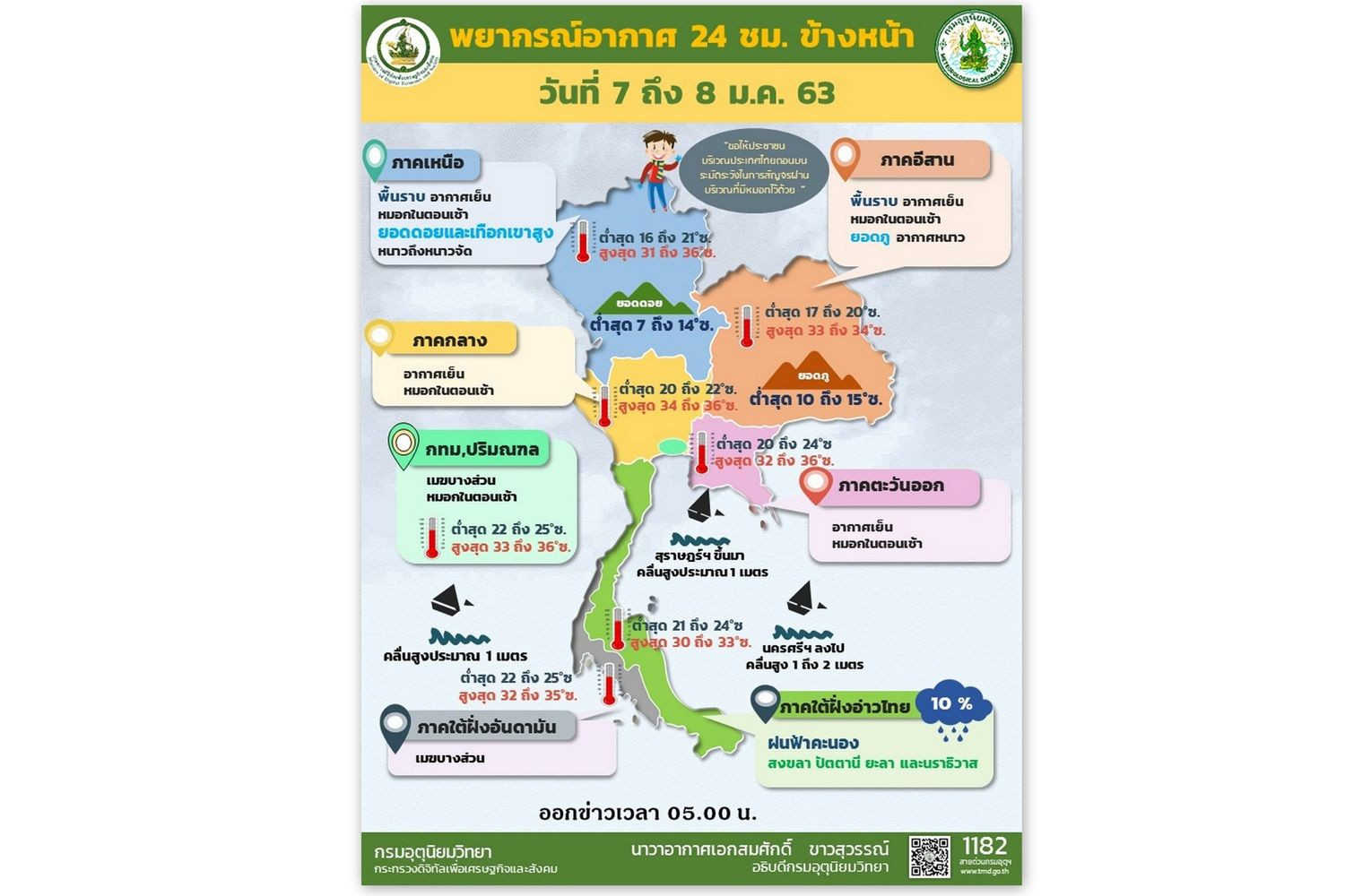 กรมอุตุนิยมวิทยา รายงานลักษณะอากาศทั่วไป ประจำวันที่ 7 มกราคม 2563 พยากรณ์อากาศ 24 ชั่วโมงข้างหน้า ประเทศไทยตอนบนยังคงมีอากาศเย็นกับมีหมอกในตอนเช้า ส่วนบริเวณพื้นราบของภาคเหนือและภาคตะวันออกเฉียงเหนือมีอากาศเย็น อุณหภูมิต่ำสุด 16-21 องศาเซลเซียส บริเวณยอดดอยและยอดภูมีอากาศหนาวถึงหนาวจัด อุณหภูมิต่ำสุด 7-15 องศาเซลเซียส ส่วนภาคกลางและภาคตะวันออก อุณหภูมิต่ำสุด 20-24 องศาเซลเซียส ส่วนในตอนกลางวันมีแสงแดดจัด ขอให้ประชาชนบริเวณประเทศไทยตอนบนระมัดระวังในการสัญจรผ่านบริเวณที่มีหมอกไว้ด้วย