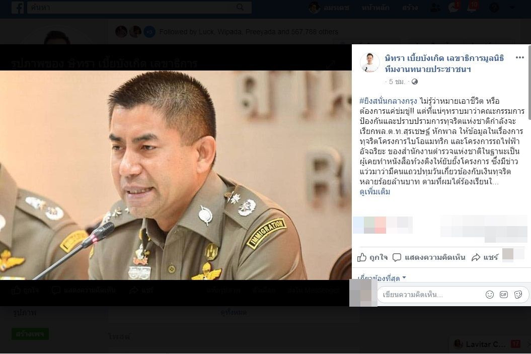 นายษิทรา เบี้ยบังเกิด โพสต์เฟซบุ๊ก“ษิทรา เบี้ยบังเกิด เลขาธิการมูลนิธิ ทีมงานทนายประชาชนฯ” ระบุว่า ยิงสนั่นกลางกรุง ไม่รู้ว่าหมายเอาชีวิต หรือต้องการแค่ข่มขู่ แต่ที่แน่ๆ ทราบมาว่า คณะกรรมการป้องกันและปราบปรามการทุจริตแห่งชาติกำลังจะเรียก พล.ต.ท.สุรเชษฐ์ หักพาล ให้ข้อมูลในเรื่องการทุจริตโครงการไบโอแมทริก และโครงการรถไฟฟ้าอัจฉริยะของสำนักงานตำรวจแห่งชาติ ในฐานะเป็นผู้เคยทำหนังสือท้วงติงให้ยับยั้งโครงการ ซึ่งมีข่าวแว่วมาว่า มีคนแถวปทุมวันเกี่ยวข้องกับเงินทุจริตหลายร้อยล้านบาท ตามที่ผมได้ร้องเรียนให้มีการตรวจสอบไป ซึ่งหาก พล.ต.ท.สุรเชษฐ์ฯ ไปให้ข้อมูลจริง น่าจะไปถึงคนที่ชักใยอยู่เบื้องหลังทั้งหมด เว้นแต่การยิงครั้งนี้จะทำให้ พล.ต.ท.สุรเชษฐ์ฯ ไม่อยากไปให้ข้อมูล