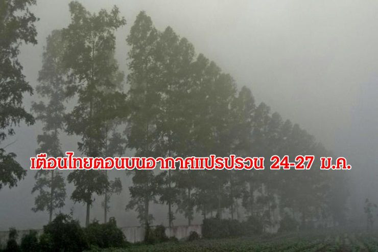กรมอุตุฯ เผย 24-27 ม.ค. ไทยตอนบนอากาศแปรปรวน ภาคเหนือ อีสานฝนคะนอง ลมแรงบางแห่ง ก่อนอุณหภูมิลดลง  ภาคกลาง ตะวันออก ใต้ กทม.ฝนเล็กน้อย