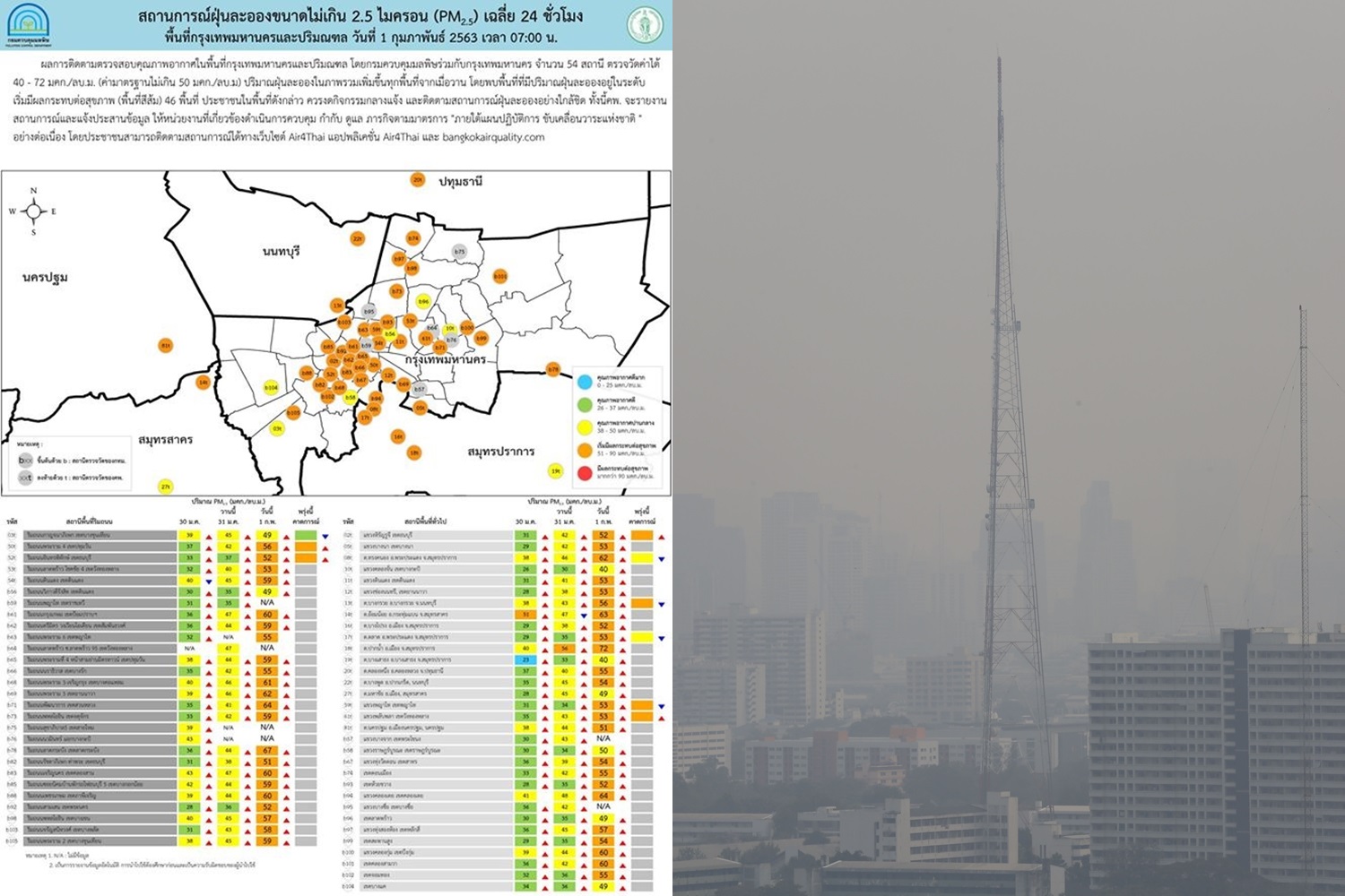ผลการติดตามตรวจสอบคุณภาพอากาศในพื้นที่กรุงเทพมหานครและปริมณฑล โดยกรมควบคุมมลพิษร่วมกับกรุงเทพมหานคร จำนวน 54 สถานี ตรวจวัดค่าได้ 40 – 72 มคก./ลบ.ม. (ค่ามาตรฐานไม่เกิน 50 มคก./ลบ.ม) ปริมาณฝุ่นละอองในภาพรวมมีแนวโน้มเพิ่มขึ้นทุกพื้นที่จากเมื่อวาน โดยพบพื้นที่ที่มีปริมาณฝุ่นละอองอยู่ในระดับเริ่มมีผลกระทบต่อสุขภาพ (พื้นที่สีส้ม) 46 พื้นที่ อาทิ บริเวณแขวงหิรัญรูจี เขตธนบุรี กรุงเทพฯ, แขวงบางนา เขตบางนา กรุงเทพฯ, แขวงดินแดง เขตดินแดง กรุงเทพฯ, แขวงช่องนนทรี เขตยานนาวา กรุงเทพฯ, ริมถนนพระราม 4 เขตปทุมวัน กรุงเทพฯ, ริมถนนอินทรพิทักษ์ เขตธนบุรี กรุงเทพฯ, ริมถนนลาดพร้าว เขตวังทองหลาง กรุงเทพฯ, ริมถนนดินแดง เขตดินแดง กรุงเทพฯ, แขวงพญาไท เขตพญาไท กรุงเทพฯ, แขวงพลับพลา เขตวังทองหลาง กรุงเทพฯ ประชาชนในพื้นที่ดังกล่าวควรงดกิจกรรมกลางแจ้ง และติดตามสถานการณ์ฝุ่นละอองอย่างใกล้ชิด