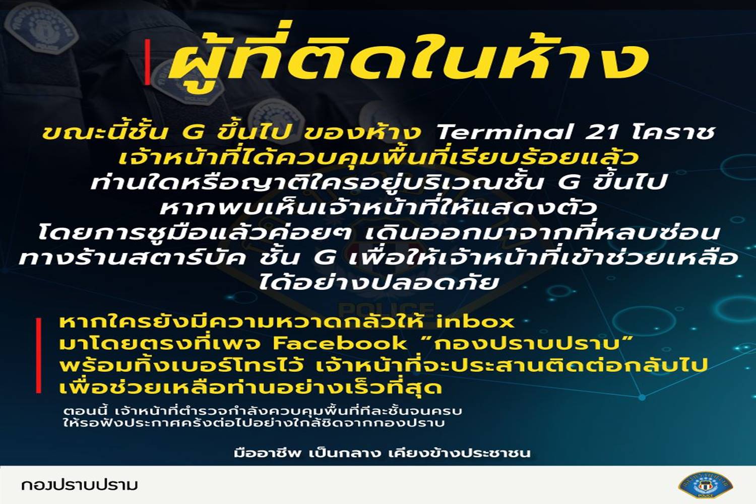 หากพบเห็นเจ้าหน้าที่ให้แสดงตัว โดยการชูมือแล้วค่อยๆ เดินออกมาจากที่หลบซ่อนทางร้านสตาร์บัค ชั้น G เพื่อให้เจ้าหน้าที่เข้าช่วยเหลือได้อย่างปลอดภัย