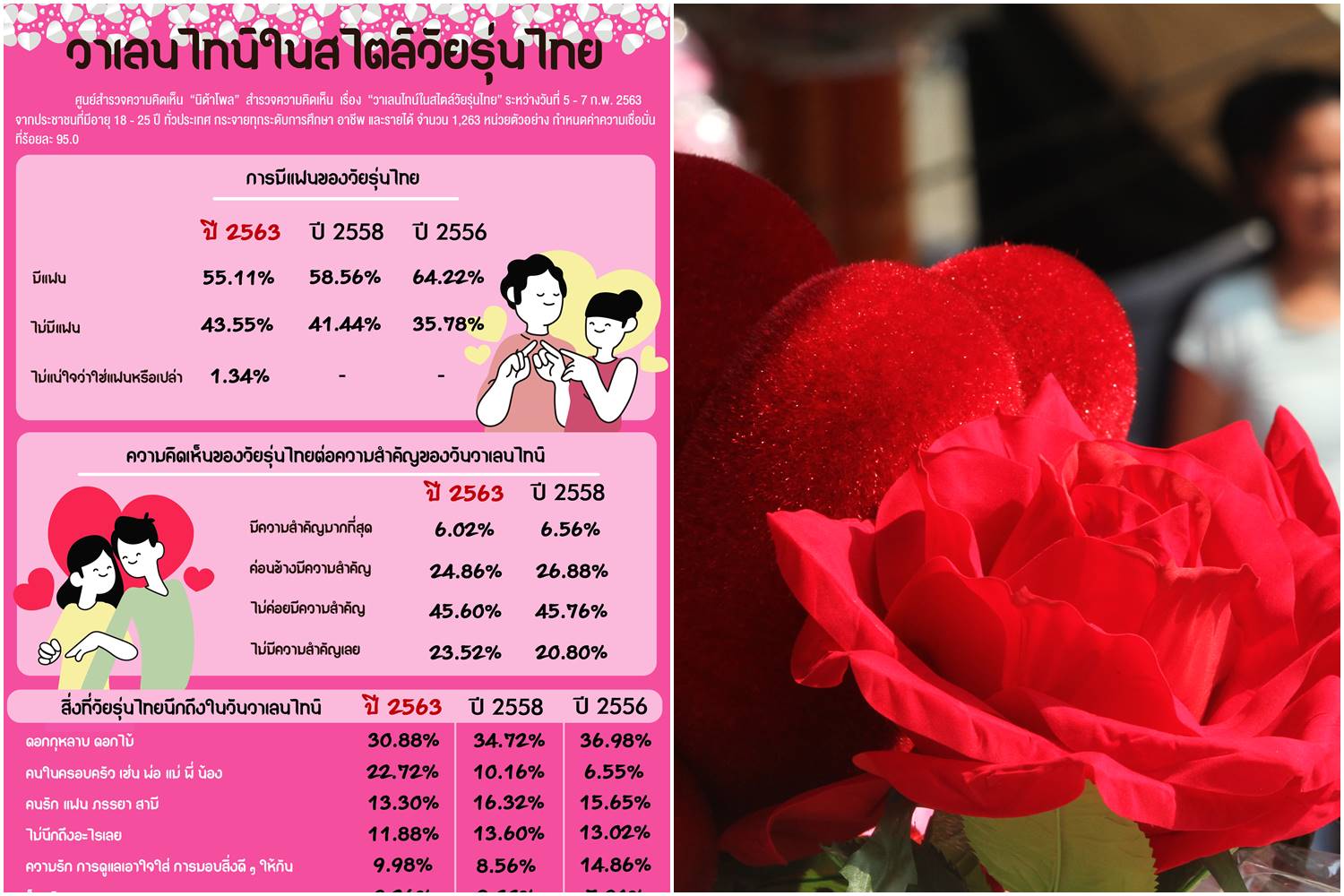 เมื่อวันที่ 9 ก.พ. 63 ศูนย์สำรวจความคิดเห็น “นิด้าโพล” สถาบันบัณฑิตพัฒนบริหารศาสตร์ (นิด้า) เปิดเผยผลสำรวจของประชาชน เรื่อง “วาเลนไทน์ในสไตล์วัยรุ่นไทย” ทำการสำรวจระหว่างวันที่ 5 – 7 กุมภาพันธ์ 2563 จากประชาชนที่มีอายุ 18 - 25 ปี กระจายทุกภูมิภาค ระดับการศึกษา และอาชีพ ทั่วประเทศ รวมทั้งสิ้น จำนวน 1,263 หน่วยตัวอย่าง เกี่ยวกับความคิดเห็นที่มีต่อวันวาเลนไทน์ ซึ่งตรงกับวันที่ 14 กุมภาพันธ์ ของทุกปี