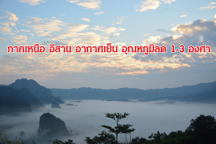 ภาคตะวันออกเฉียงเหนือบริเวณพื้นราบ อากาศเย็นกับมีหมอกในตอนเช้าอุณหภูมิต่ำสุด 17-21 องศาเซลเซียสอุณหภูมิสูงสุด 31-33 องศาเซลเซียสบริเวณยอดภู มีอากาศหนาว อุณหภูมิต่ำสุด 8-15 องศาเซลเซียสลมตะวันออก ความเร็ว 10-25 กม./ชม.