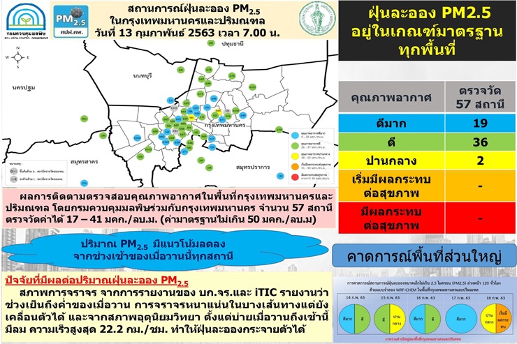 เฟซบุ๊ก กรมควบคุมมลพิษ ขอรายงานข้อมูลคุณภาพอากาศ ประจำวันที่ 13 กุมภาพันธ์ 2563 เวลา 07.00 น. ดังนี้