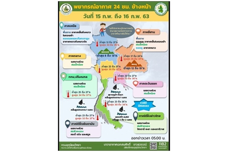 อนึ่ง ในช่วงวันที่ 16-19 ก.พ. 63 บริเวณความกดอากาศสูงหรือมวลอากาศเย็นกำลังแรงจากประเทศจีนจะแผ่ลงมาปกคลุมประเทศไทยตอนบนและทะเลจีนใต้ ทำให้บริเวณภาคตะวันออกเฉียงเหนืออุณหภูมิจะลดลง 4-6 องศาเซลเซียสกับมีลมแรง ส่วนภาคกลาง และภาคตะวันออกอุณหภูมิจะลดลง 1-3 องศาเซลเซียส โดยจะมีฝนฟ้าคะนองและมีลมกระโชกแรงในระยะแรกบริเวณภาคตะวันออกเฉียงเหนือ ภาคกลาง และภาคตะวันออก สำหรับลมตะวันออกที่พัดปกคลุมอ่าวไทยและภาคใต้จะมีกำลังแรงขึ้น ทำให้ภาคใต้มีฝนเพิ่มขึ้น ส่วนคลื่นลมบริเวณอ่าวไทยและทะเลอันดามันมีกำลังแรงขึ้น โดยบริเวณอ่าวไทยตอนล่างตั้งแต่จังหวัดนครศรีธรรมราชลงไปทะเลมีคลื่นสูง 2-3 เมตร บริเวณที่มีฝนฟ้าคะนองคลื่นสูงมากกว่า 3 เมตร ขอให้ชาวเรือบริเวณดังกล่าวเดินเรือด้วยความระมัดระวัง และเรือเล็กบริเวณอ่าวไทยตอนล่างควรงดออกจากฝั่งในช่วงวันที่ 17-20 ก.พ. 63