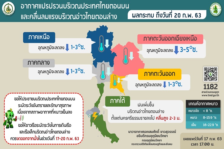ในช่วงวันที่ 18-19 ก.พ. 63 ประเทศไทยตอนบนจะมีอากาศเย็นถึงหนาว กับมีลมแรง สำหรับภาคตะวันออกเฉียงเหนืออุณหภูมิจะลดลง 2-3 องศาเซลเซียส ส่วนภาคเหนือ ภาคกลาง และภาคตะวันออก อุณหภูมิจะลดลง 1-3 องศาเซลเซียส ขอให้ประชาชนบริเวณประเทศไทยตอนบนดูแลสุขภาพ เนื่องจากสภาพอากาศที่หนาวเย็นลงนี้ไว้ด้วย