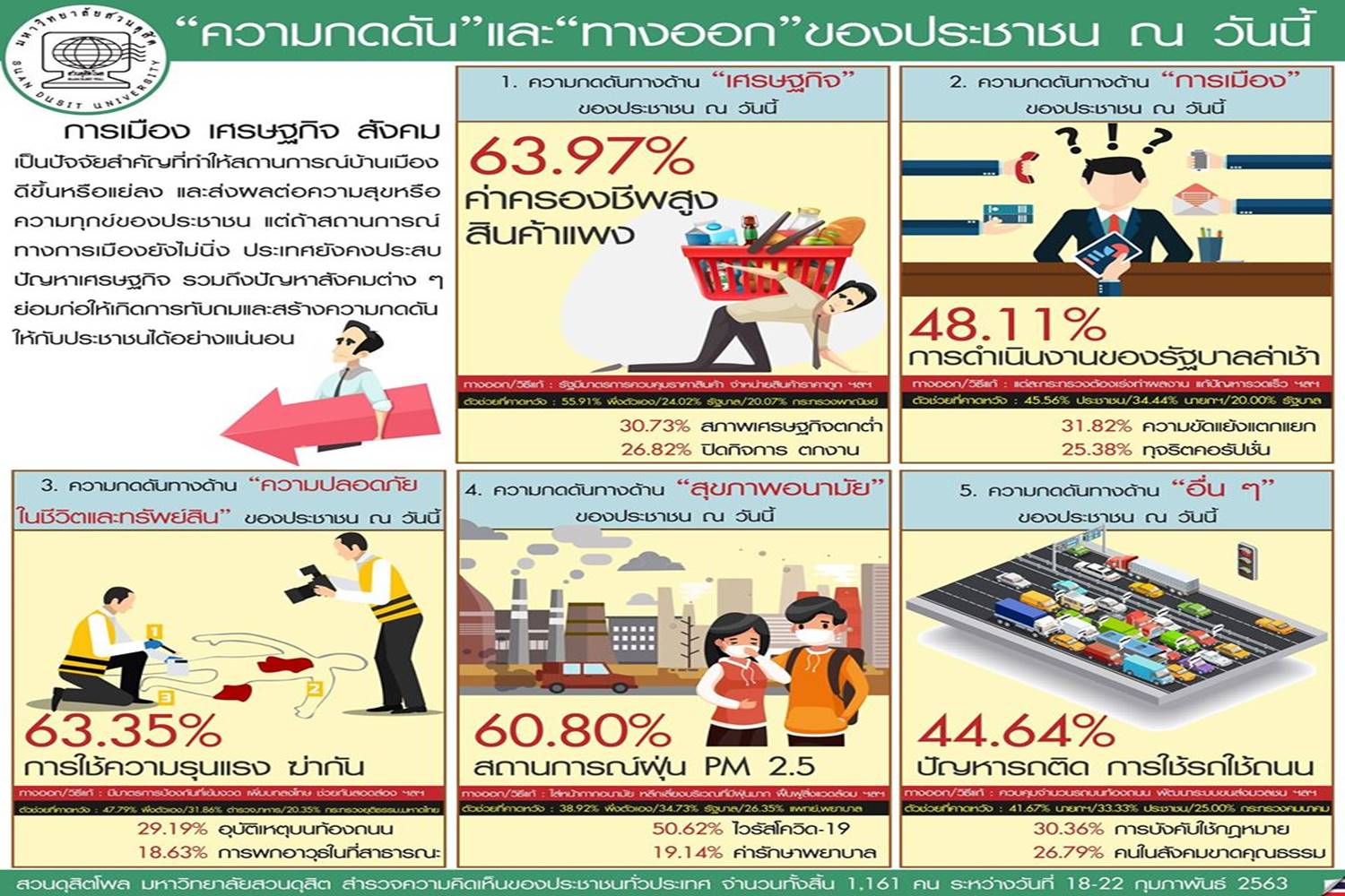 สวนดุสิตโพล มหาวิทยาลัยสวนดุสิต เปิดเผยผลสำรวจความคิดเห็นของประชาชนทั่วประเทศ เรื่อง ความกดดันและทางออกของประชาชน ณ วันนี้ โดยสำรวจความคิดเห็นกลุ่มตัวอย่าง จำนวนทั้งสิ้น 1,161 คน ระหว่างวันที่ 18-22 ก.พ. 63 กรณีการเมือง เศรษฐกิจ สังคม เป็นปัจจัยสำคัญที่ทำให้สถานการณ์บ้านเมืองดีขึ้นหรือแย่ลง และส่งผลต่อความสุขหรือความทุกข์ของประชาชน แต่ถ้าสถานการณ์ทางการเมืองยังไม่นิ่ง ประเทศยังคงประสบปัญหาเศรษฐกิจ รวมถึงปัญหาสังคมต่างๆ ย่อมก่อให้เกิดการทับถมและสร้างความกดดันให้กับประชาชนได้อย่างแน่นอน สรุปผลได้ ดังนี้