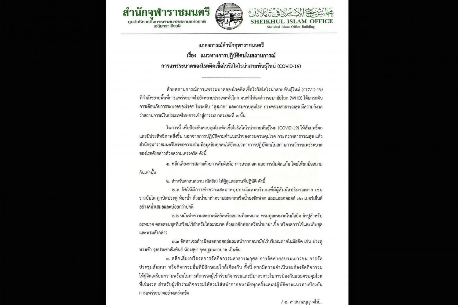 เมื่อวันที่ 5 มี.ค. สำนักจุฬาราชมนตรี แถลงการณ์ เรื่องแนวทางการปฏิบัติตนในสถานการณ์การแพร่ระบาดของโรคติดเชื้อไวรัสโคโรน่าสายพันธุ์ใหม่ (COVID-19) แก่ชาวมุสลิม โดยมีเนื้อหาดังนี้