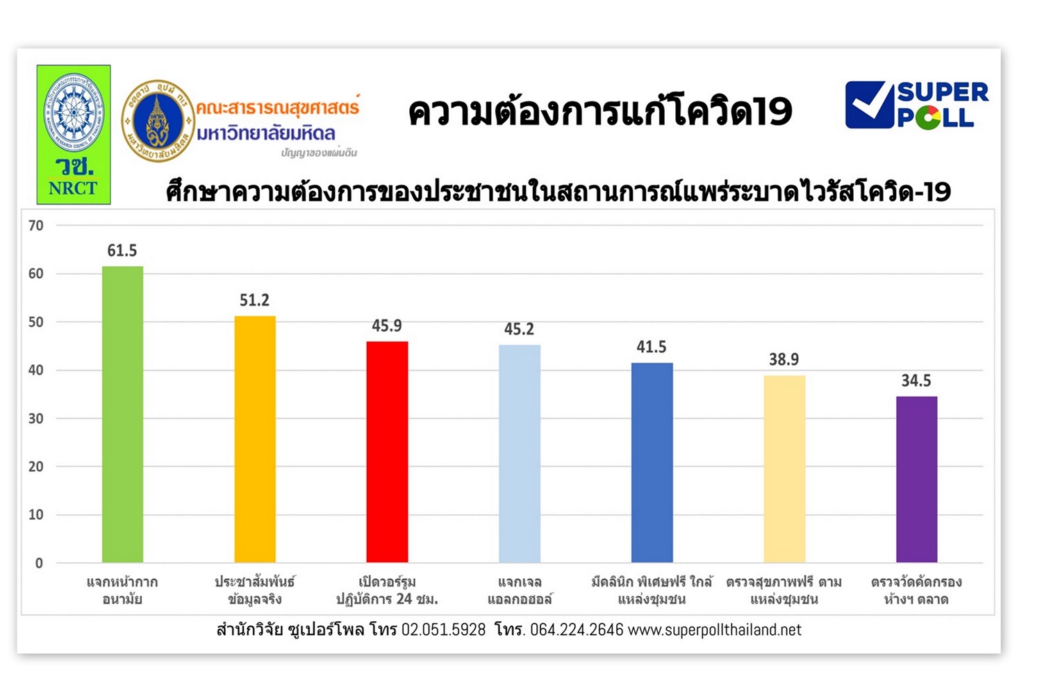 ที่น่าพิจารณา คือ ความต้องการของประชาชน เรื่องการแพร่ระบาดเชื้อไวรัสโควิด-19 พบว่า ส่วนใหญ่หรือร้อยละ 61.5 ระบุ แจกหน้ากากอนามัย ร้อยละ 51.2 ระบุ ประชาสัมพันธ์ให้ทราบข้อมูลที่เชื่อถือได้เป็นจริง ร้อยละ 45.9 ระบุ เปิดวอร์รูม ศูนย์ปฏิบัติการ 24 ชั่วโมง ตอบคำถาม ช่วยเหลือประชาชน ร้อยละ 45.2 ระบุ แจกเจลแอลกอฮอล์ ล้างมือ ร้อยละ 41.5 ระบุ มีคลินิกพิเศษ เฉพาะกิจ บริการฟรีประชาชนตามจุดชุมชนต่าง ๆ ตามเมืองใหญ่ แหล่งท่องเที่ยว และบอกให้ประชาชนรู้ด้วย ร้อยละ 38.9 ระบุตรวจสุขภาพฟรีตามจุดชุมชนหนาแน่น จุดเสี่ยง และร้อยละ 34.5 ตรวจวัดไข้ ตามแหล่งคนหนาแน่น เช่น ห้างสรรพสินค้า ตลาดสด ตามลำดับ