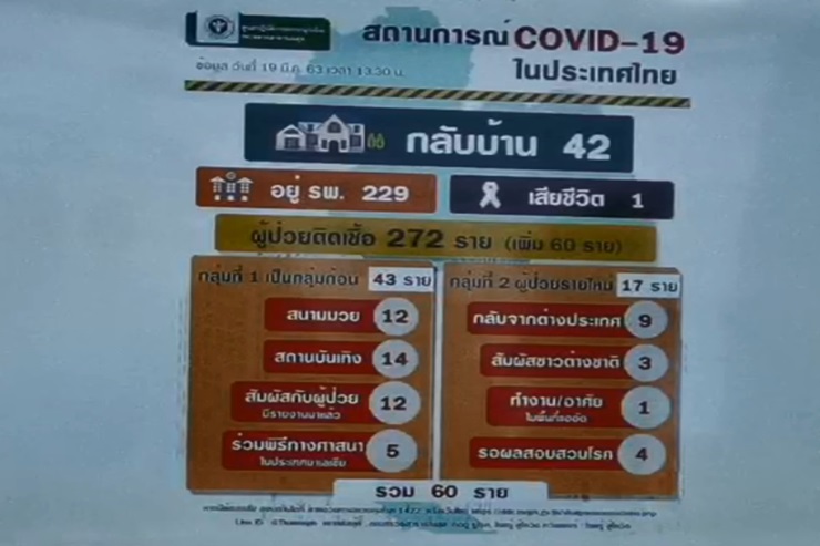 กระทรวงสาธารณสุข เผยยอดผู้ป่วย ติดเชื้อโควิด-19 เพิ่มอีก 60 ราย ติดจากกลุ่มสนามมวย สถานบันเทิง รวมยอดสะสม 272 ราย