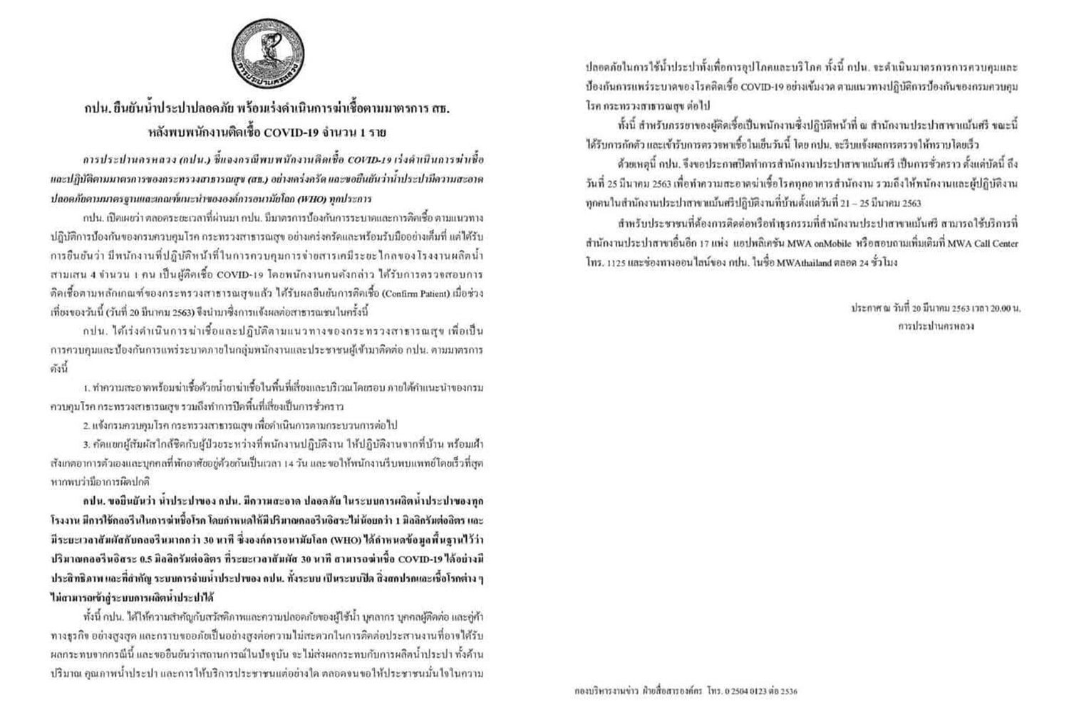 กปน.พบพนักงานติด COVID-19 ยันคลอรีนฆ่าเชื้อได้ ระบบน้ำประปาปลอดภัย ได้ทำความสะอาดพื้นที่เสี่ยงและบริเวณโดยรอบแล้ว ตามมาตรการกระทรวงสาธารณสุข