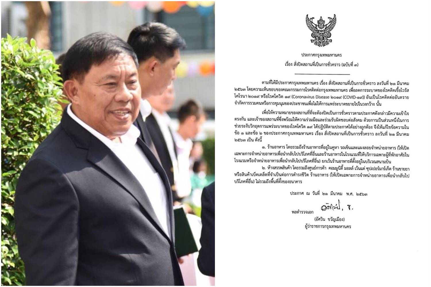 เมื่อวันที่ 22 มี.ค. 63 พล.ต.อ. อัศวิน ขวัญเมือง ผู้ว่าราชการกรุงเทพมหานคร (กทม.) ได้ออกประกาศเรื่องสั่งปิดสถานที่เป็นการชั่วคราว (ฉบับที่3) เพื่อลดการระบาดของเชื้อไวรัสโควิด 19 โดยมีสาระสำคัยคือ