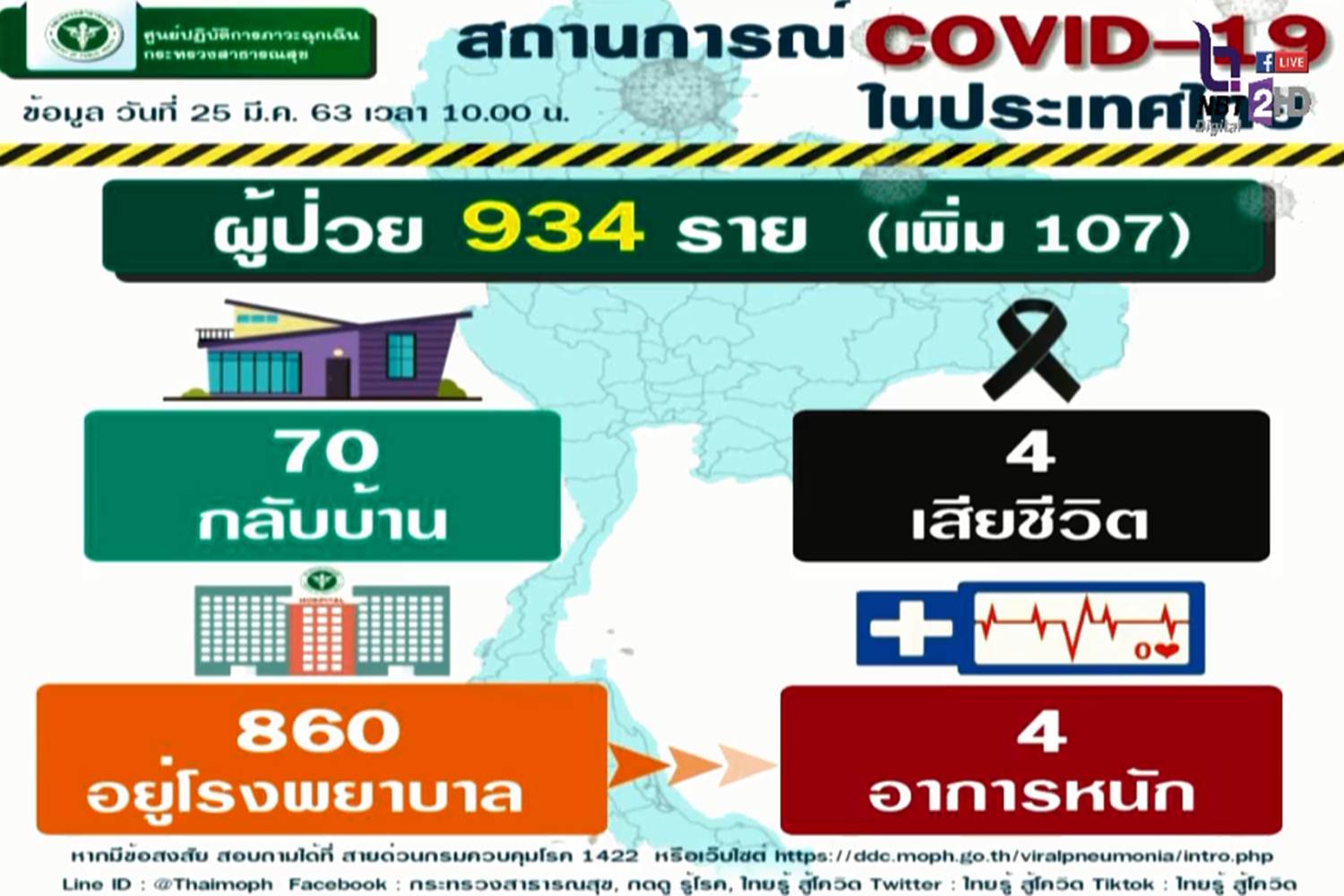 -ยอดผู้ป่วยสะสม ณ วันที่ 25 มี.ค.63 จำนวน 934 ราย รักษาตัวที่โรงพยาบาล 860 ราย หายกลับบ้านแล้ว 70 ราย อาการหนัก 4 ราย เสียชีวิต 4 ราย