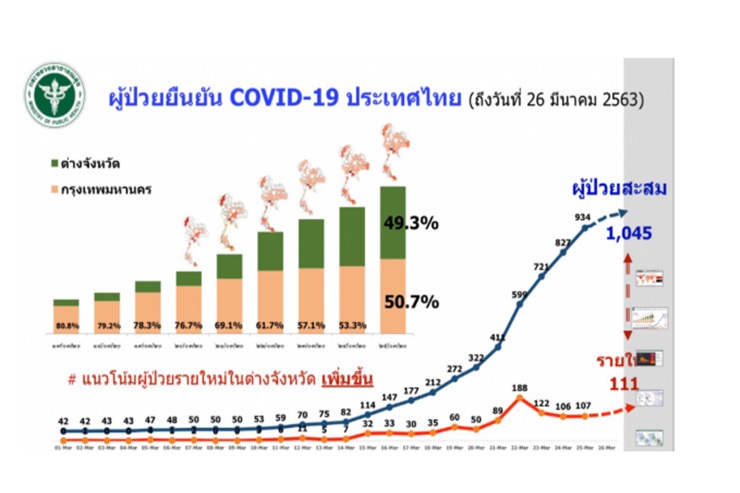 -ยอดผู้ป่วยสะสม ณ วันที่ 26 มี.ค.63 ยอดสะสมเพิ่มเป็น 1,045 ราย เสียชีวิตรวม 4 ราย รักษาหายกลับบ้านแล้วเพิ่ม 18 คน รวมกลับบ้านแล้ว 88 ราย อาการหนัก 4 ราย ยังรักษาตัวอยู่โรงพยาบาล 953 ราย