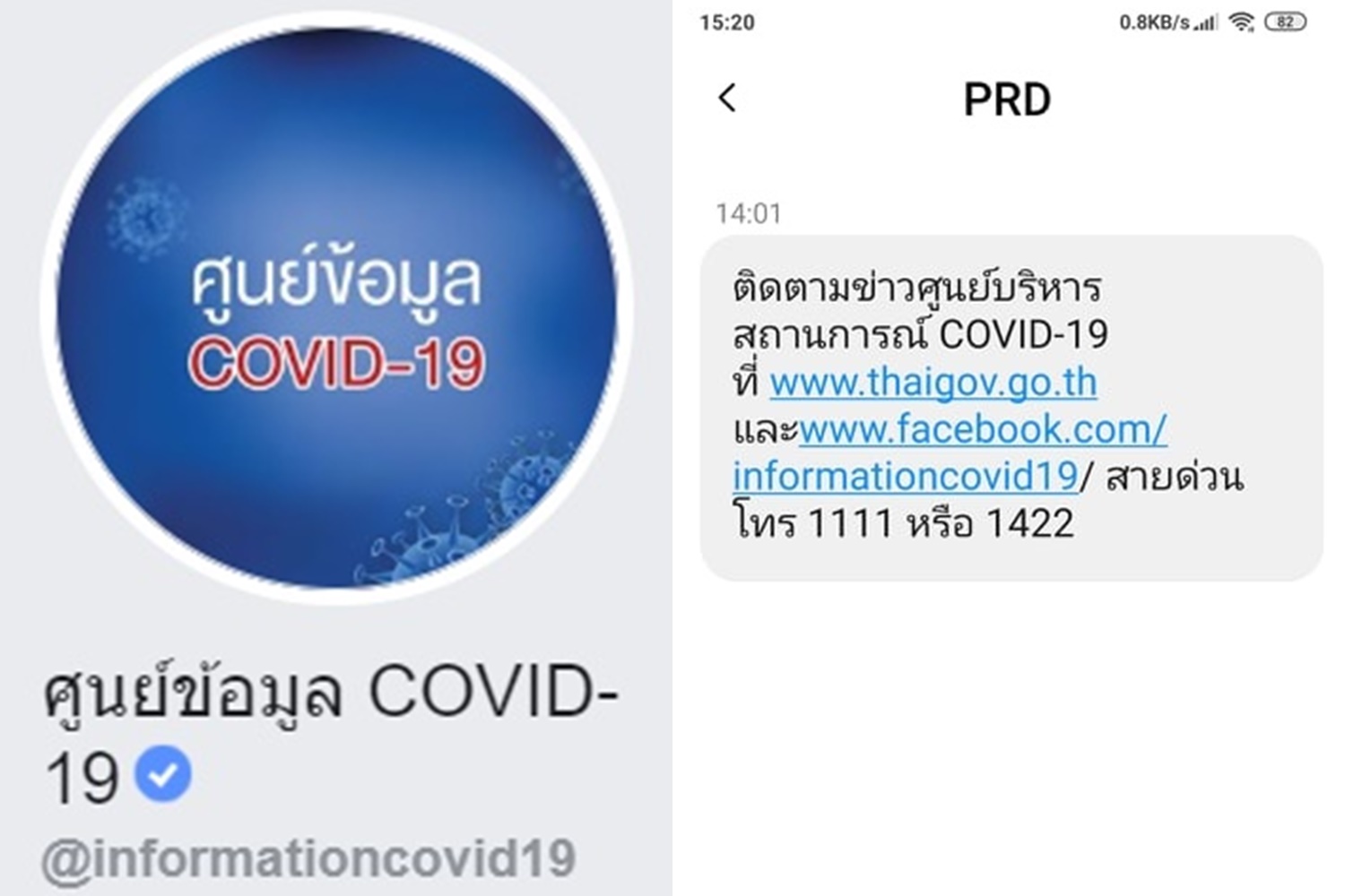 ศูนย์ข้อมูล COVID-19 แจ้งข้อความผ่านโทรศัพท์มือทุกเครือข่ายในประเทศไทย แจ้งให้ประชาชนผู้ใช้มือถือ ติดตามข่าวศูนย์สถานการณ์ COVID-19 ที่ www.thaigov.go.thและที่ www.facebook.com/informationcovid19/สายด่วนโทร 1111 หรือ 1422