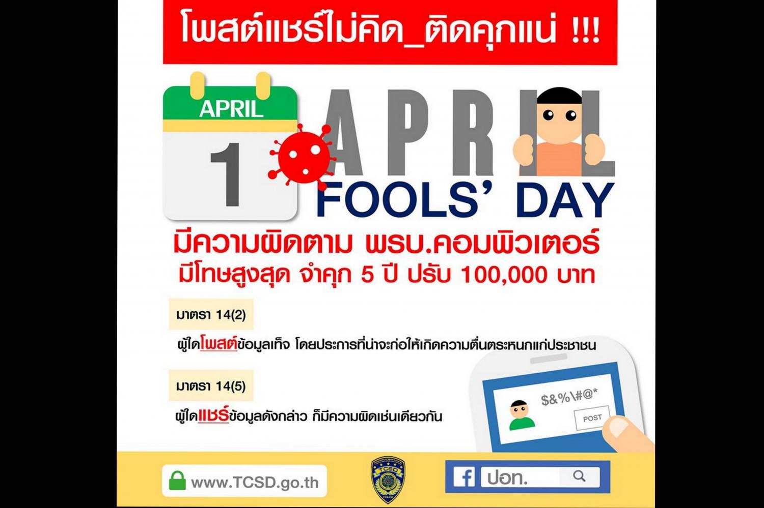 ตำรวจ ปอท.เตือน 1 เม.ย.นี้ วัน April Fool's Day อย่าโกหกเรื่องโควิด-19 ชี้โทษหนักคุกไม่เกิน5ปี-ปรับไม่1แสน หรือทั้งจำทั้งปรับ