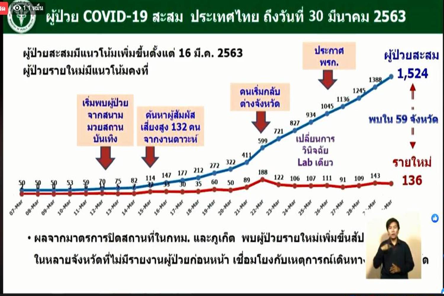 ศบค.แถลงพบผู้ป่วยโควิด-19 รายใหม่ 136 คน ยอดสะสม 1,520 คน เผยตั้งแต่ 21 มี.ค.63 พบผู้ป่วยรายใหม่ในต่างจังหวัดมากกว่า กรุงเทพฯ